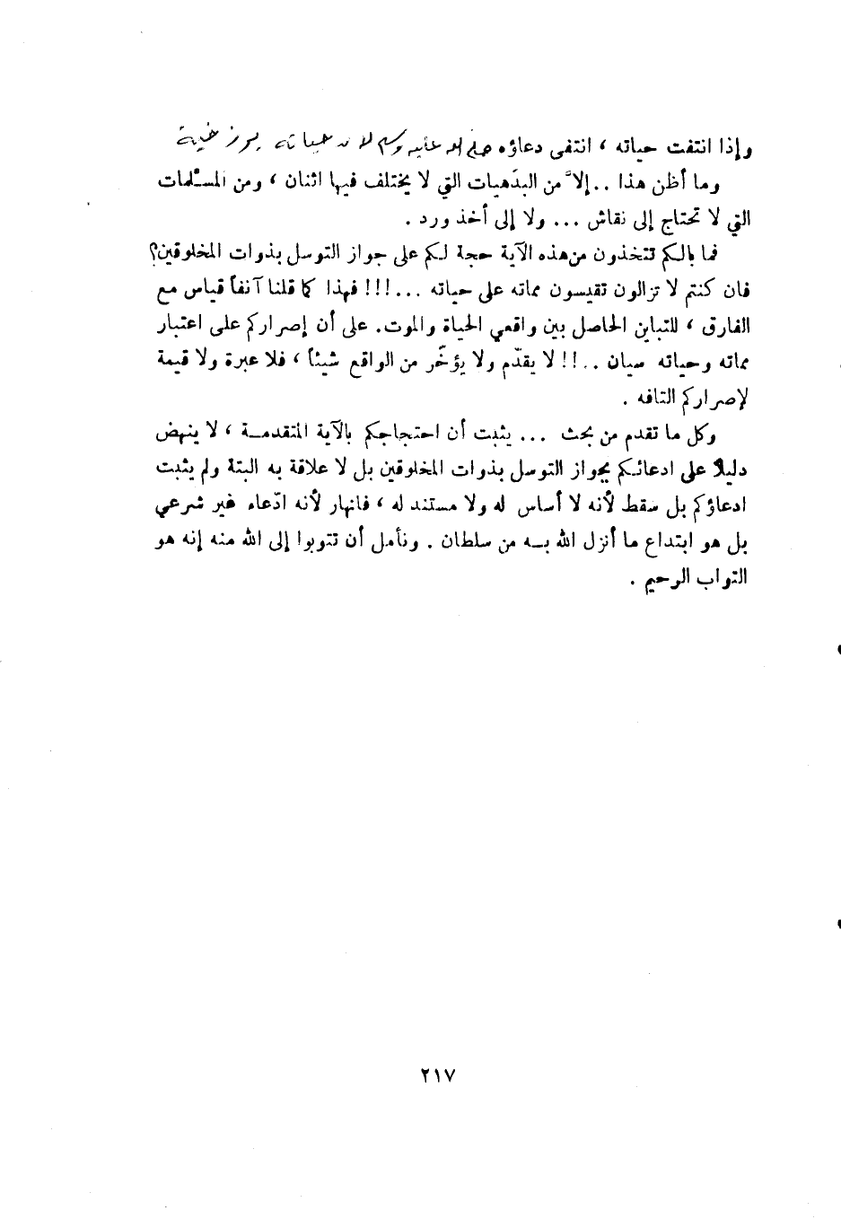 وكل ما تقدم من بحث ... يثبت أن احتجاجكم بالآية المتقدمة لا ينهض دليلاً على ادعائكم بجواز التوسل بذوات المخلوقين بل لا علاقة به البتة ولم يثبت ادعاؤكم بل سقط لأنه لا أساس له ولا مستند له فانهار لأنه ادعاء غير شرعي بل هو ابتداع ما أنزل الله به من سلطان. ونأمل أن تتوبوا إلى الله منه إنه هو التواب الرحيم.