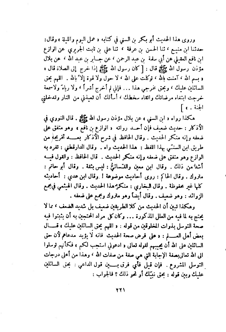 وروى هذا الحديث أبو بكر السني في كتابه ((عمل اليوم والليلة)) وقال: حدثنا ابن منيع حدثنا الحسن بن عرفة حدثنا علي بن ثابت الجريري عن الوازع ابن نافع العقيلي عن أبي سلمة بن عبد الرحمن عن جابر بن عبد الله عن بلال مؤذن رسول الله - صلى الله عليه وسلم - قال: [كان رسول الله - صلى الله عليه وسلم - إذا خرج إلى الصلاة قال: ((بسم الله آمنت بالله توكلت على الله لا حول ولا قوة إلا بالله اللهم بحق السائلين عليك وبحق مخرجي هذا ... فإني لم أخرج أشراً ولا رياء ولا سمعة خرجت ابتغاء مرضاتك واتقاء سخطك أسألك أن تعيذني من النار وتدخلني الجنة))].