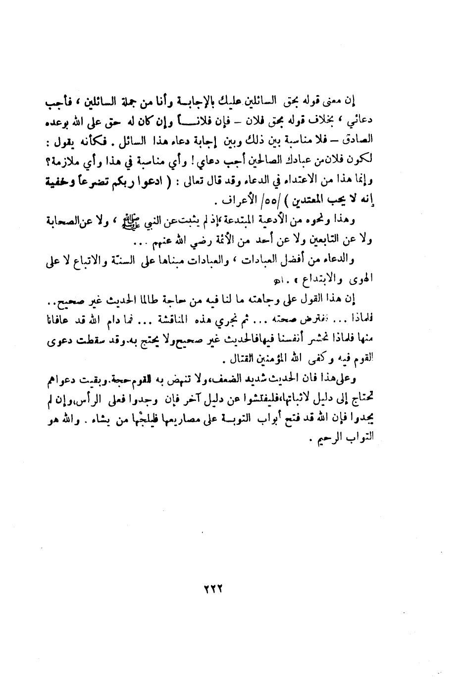 إن معنى قوله بحق السائلين عليك بالإجابة وأنا من جملة السائلين فأجب دعائي بخلاف قوله بحق فلان - فإن فلاناً وإن كان له حق على الله بوعده الصادق - فلا مناسبة بين ذلك وبين إجابة هذا السائل فكأنه يقول: لكون فلان من عبادك الصالحين أجب دعاي! وأي مناسبة في هذا وأي ملازمة؟ وإنما هذا من الاعتداء في الدعاء وقد قال تعالى: (ادعو ربكم تضرعاً وخفية إنه لا يحب المعتدين) /55/ الأعراف.