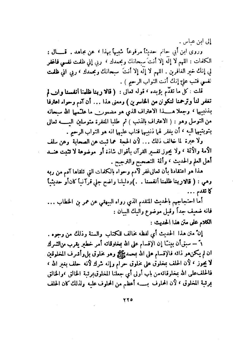 وروى ابن أبي حاتم حديثاً مرفوعاً شبيهاً بهذا عن مجاهد. قال: الكلمات: اللهم لا إله إلا أنت سبحانك وبحمدك ربي إني ظلمت نفسي فاغفر لي إنك خير الغافرين. اللهم لا إله لا أنت سبحانك وبحمدك ربي إني ظلمت نفسي فتب علي إنك أنت التواب الرحيم).