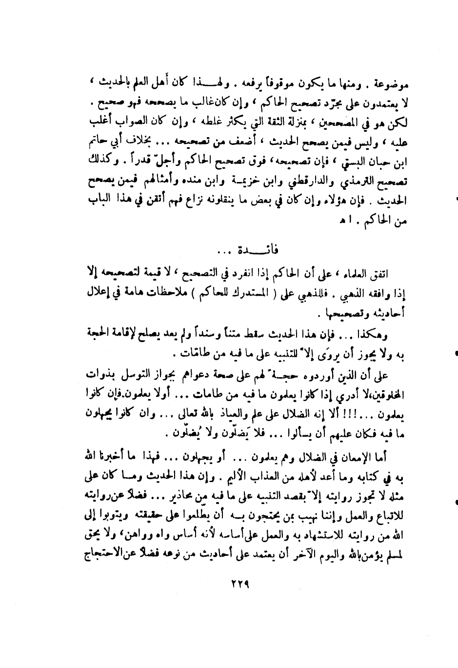 موضوعة ومنها ما يكون موقوفاً يرفعه ولهذا كان أهل العلم بالحديث لا يعتمدون على مجرد تصحيح الحاكم وإن كان غالب ما يصححه فهو صحيح. لكن هو في المصححين بمنزلة الثقة التي يكثر غلطه وإن كان الصواب اغلب عليه وليس فيمن يصحح الحديث أضعف من تصحيحه بخلاف أبي حاتم ابن حبان البستي فإن تصحيحه فوق تصحيح الحاكم وأجل وأقدر وكذلك تصحيح الترمذي والدارقطني وابن خزيمة وابن منده وأمثالهم فيمن يصحح الحديث فإن هؤلاء وإن كان في بعض ما ينقلونه نزاع فهم أتقن في هذا الباب من الحاكم. اهـ.