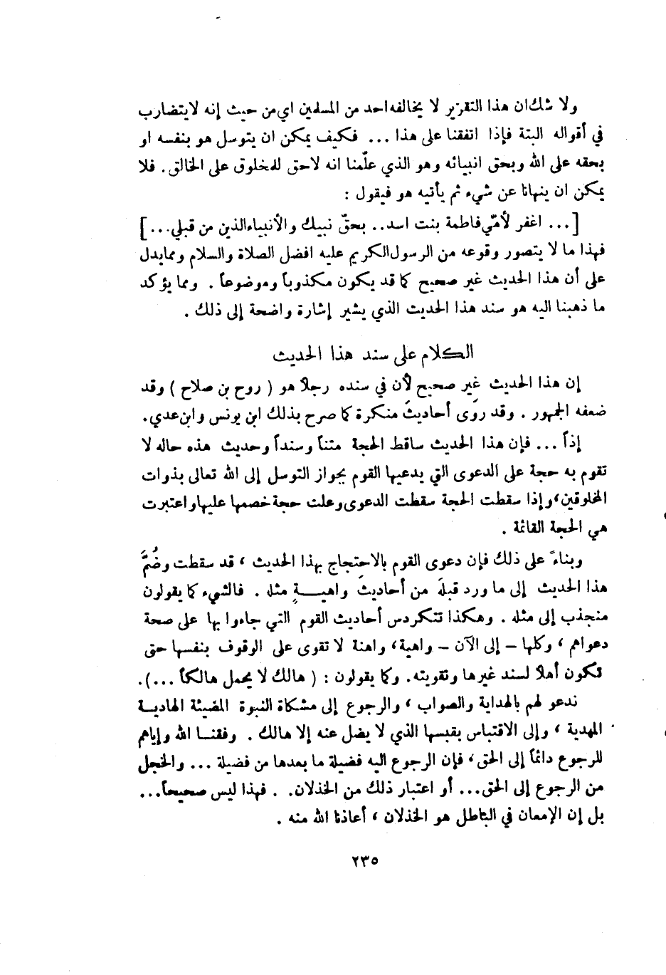 [ ... اغفر لأمي فاطمة بنت أسد .. بحق نبيك والأنبياء الذين من قبلي ... ] فهذا ما لا يتصور وقوعه من الرسول الكريم عليه أفضل الصلاة والسلام ومما يدل على أن هذا الحديث غير صحيح كما قد يكون مكذوباً وموضوعاً. ومما يؤكد ما ذهبنا غليه هو سند هذا الحديث الذي يشير إشارة واضحة إلى ذلك.