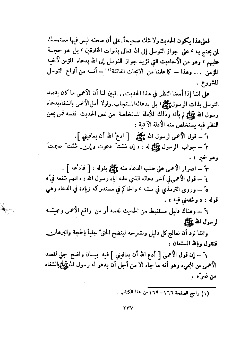 على أننا إذا أمعنا النظر في هذا الحديث ... تبين لنا أن الأعمى ما كان يقصد التوسل بذات الرسول - صلى الله عليه وسلم - بل بدعائه المستجاب ولولا أمل الأعمى بالشفاء بدعاء رسول الله - صلى الله عليه وسلم - لم يأت وذلك للأدلة المستخلصة من نص الحديث نفسه فمن يمعن النظر فيه يستخلص منه الأدلة الآتية: