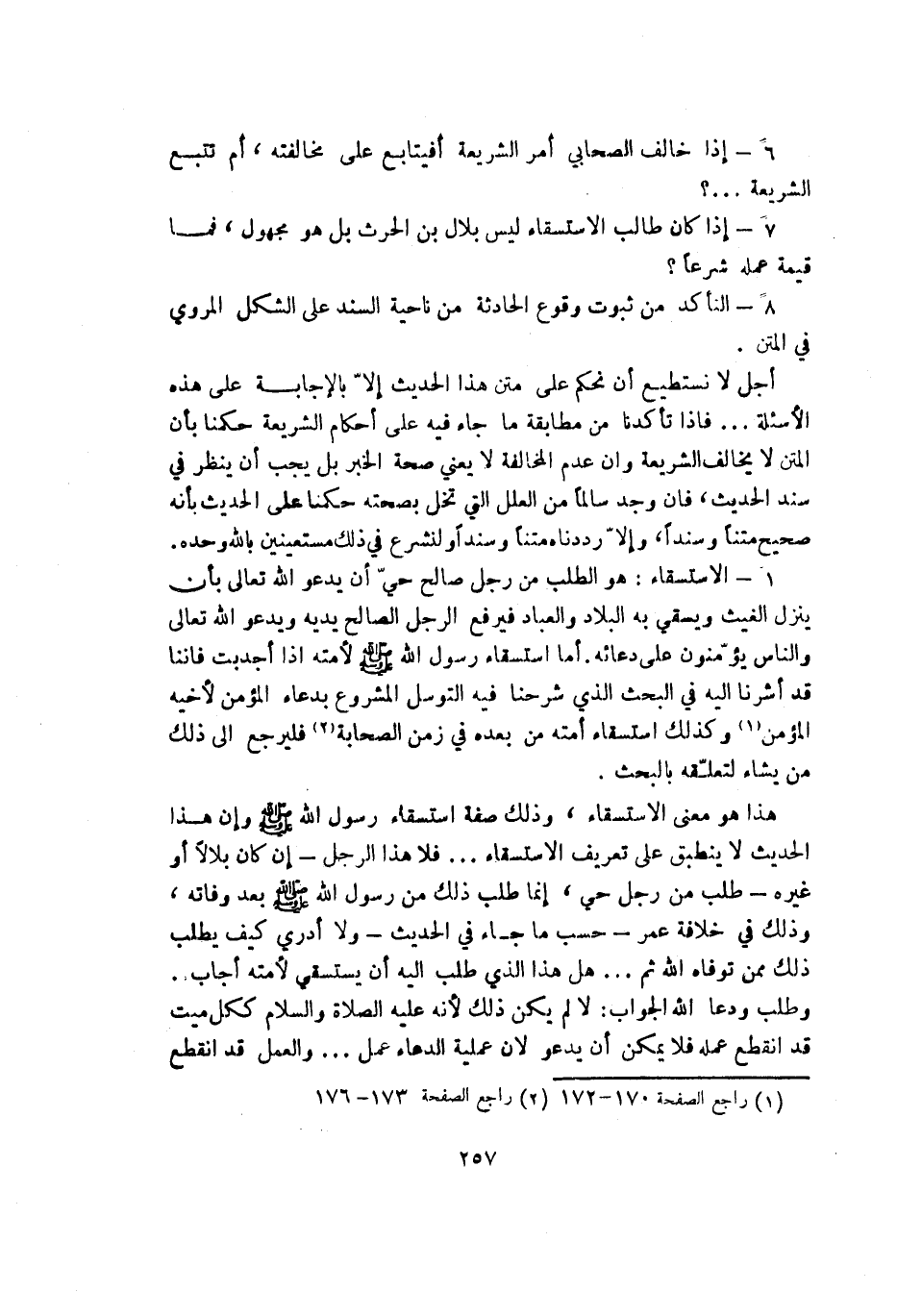 1 - الاستسقاء: هو الطلب من رجل صالح حي أن يدعو الله تعالى بأن ينزل الغيث ويسقي به البلاد والعباد فيرجع الرجل الصالح يديه ويدعو الله تعالى والناس يؤمنون على دعائه أما استسقاء رسول الله - صلى الله عليه وسلم - لأمته إذا أجدبت فإننا قد أشرنا غليه في البحث الذي شرحنا فيه التوسل المشروع بدعاء المؤمن لأخيه المؤمن (¬1) وكذلك استسقاء أمته من بعده في زمن الصحابة (¬2) فليرجع إلى ذلك من يشاء لتعلقه بالبحث.