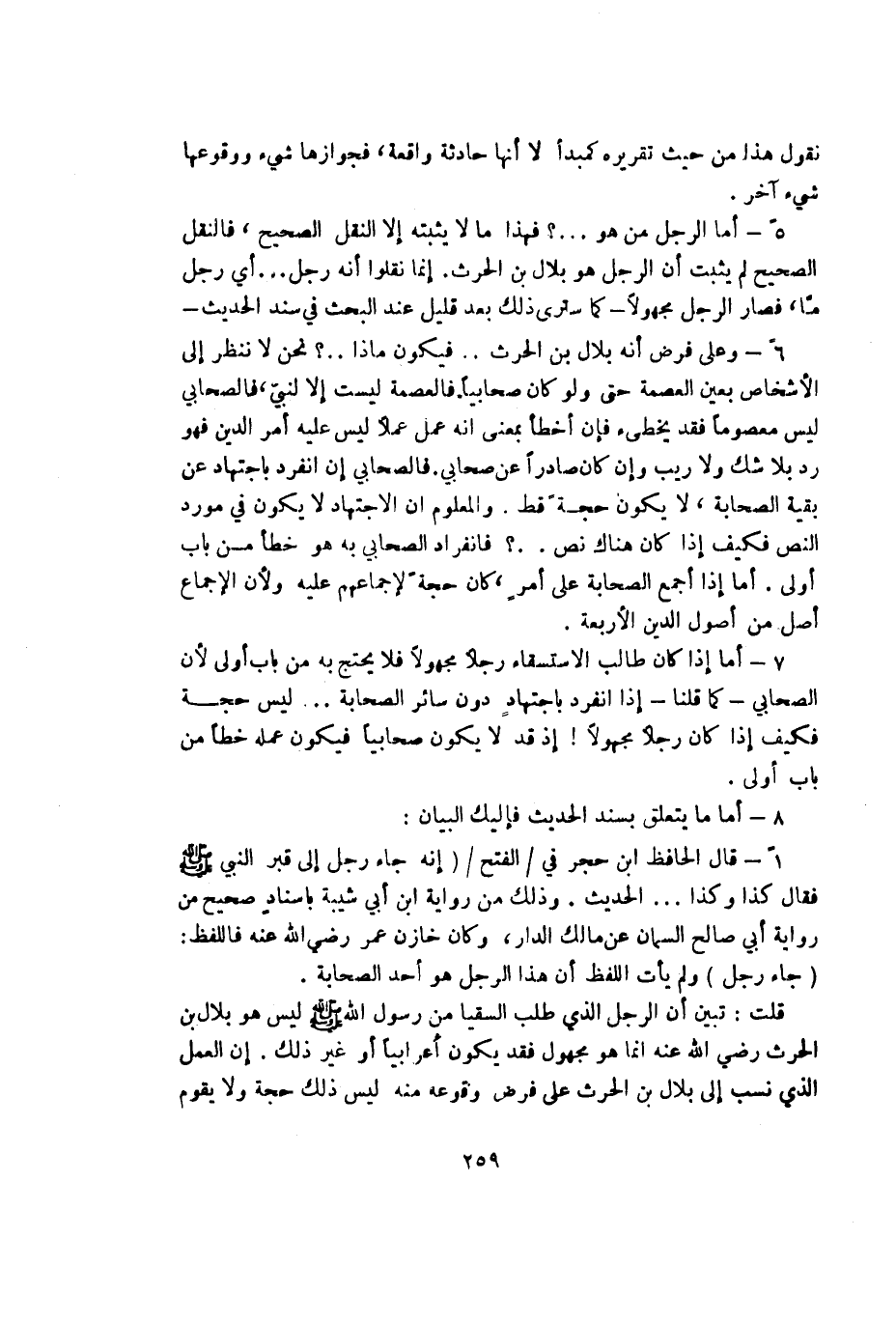 6 - وعلى فرض أنه بلال بن الحرث فيكون ماذا؟ نحن لا ننظر إلى الأشخاص بعين العصمة حتى ولو كان صحابياً فالعصمة ليست إلا لنبي فالصحابي ليس معصوماً فقد يخطئ فإن أخطأ بمعنى أنه عمل عملاً ليس عليه أمر الدين فهو رد بلا شك ولا ريب وإن كان صادراً عن صحابي فالصحابي إن انفرد باجتهاد عن بقية الصحابة لا يكون حجة قط والمعلوم أن الاجتهاد لا يكون في مورد النص فكيف إذا كان هناك نص .. ؟ فانفراد الصحابي به هو خطأ من باب أولى أما إذا أجمع الصحابة على أمر كان حجة لإجماعهم عليه ولأن الإجماع أصل من أصول الدين الأربعة.