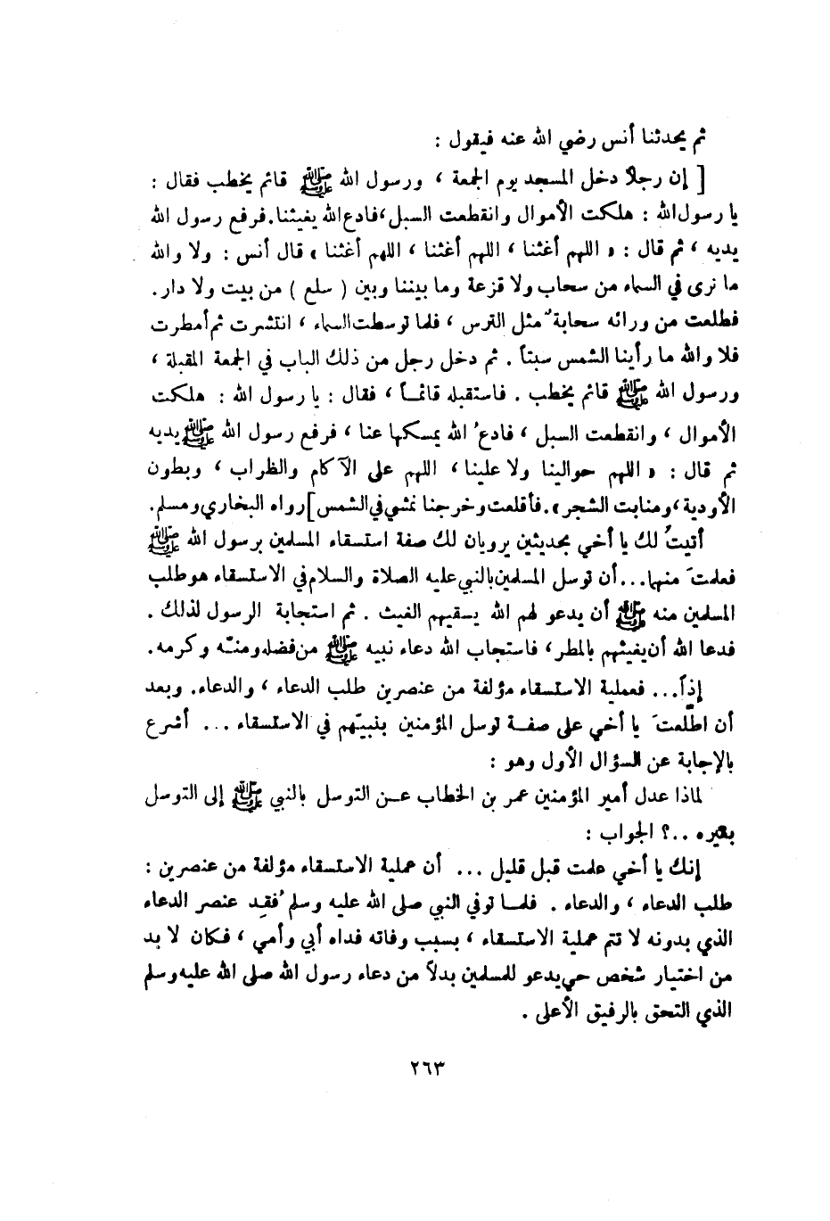 [إن رجلاً دخل المسجد يوم الجمعة ورسول الله - صلى الله عليه وسلم - قائم يخطب فقال: يا رسول الله: هلكت الأموال وانقطعت السبل فادع الله أن يغيثنا فرفع رسول الله يديه ثم قال: ((اللهم أغثنا اللهم أغثنا اللهم أغثنا)) قال أنس: ولا والله ما نرى في السماء من سحاب ولا قزعة وما بيننا وبين (سلع) من بيت ولا دار. فطلعت من ورائه سحابة مثل الترس فلما توسطت السماء انتشرت ثم أمطرت فلا والله ما رأينا الشمس سبتاً ثم دخل من ذلك الباب في الجمعة المقبلة ورسول الله - صلى الله عليه وسلم - قائم يخطب فاستقبله قائماً فقال: يا رسول الله: هلكت الأموال وانقطعت السبل فادع الله يمسكها عنا فرفع رسول الله - صلى الله عليه وسلم - يديه ثم قال: ((اللهم حوالينا ولا علينا اللهم على الآكام والظراب وبطون الأودية ومنابت الشجر)) فأقلعت وخرجنا نمشي في الشمس] رواه البخاري ومسلم.