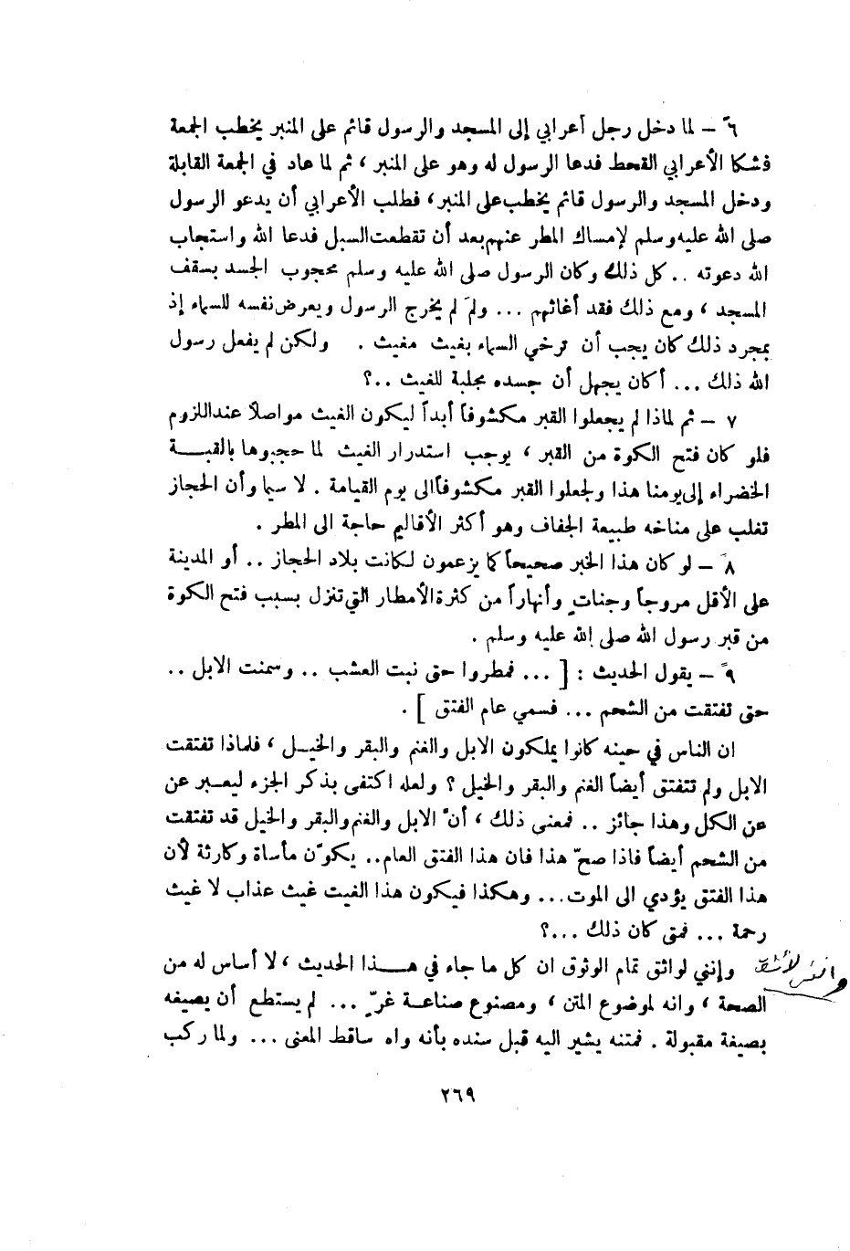 6 - لما دخل رجل أعرابي إلى المسجد والرسول قائم على المنبر يخطب الجمعة فشكا الأعرابي القحط فدعا الرسول له وهو على المنبر ثم لما عاد في الجمعة القابلة ودخل المسجد والرسول قائم يخطب على المنبر فطلب الأعرابي أن يدعو الرسول صلى لإمساك المطر عنهم بعد أن تقطعت السبل فدعا الله واستجاب الله دعوته كل ذلك وكان رسول الله - صلى الله عليه وسلم - محجوب الجسد بسقف المسجد ومع ذلك فقد أغاثهم ولم لم يخرج الرسول ويعرض نفسه للسماء إذ بمجرد ذلك كان يجب أن ترخي السماء بغيث مغيث. ولكن لم يفعل رسول الله ذلك أكان يجهل أن جسده مجلبة للغيث ... ؟