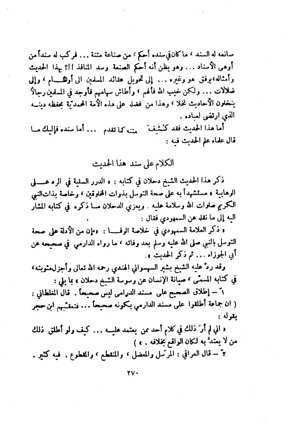 ((ذكر العلامة السمهودي في خلاصة الوفا: ((إن من الأدلة على صحة التوسل بالنبي - صلى الله عليه وسلم - بعد وفاته ما رواه الدارمي في صحيحه عن أبي الجوزاء ثم ذكر الحديث)).