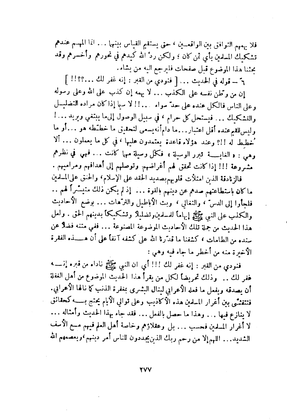 فنودي من القبر: إنه غفر لك!! أي أن النبي - صلى الله عليه وسلم - ناداه من قبره إنه غفر لك وذلك تحريضاً لكل من يقرأ هذا الحديث الموضوع من أهل الغفلة أن يصدقه ويفعل ما فعله الأعرابي لينال البشرى بمغفرة الذنب كما نالها الأعرابي فتتفشى بين أغرار المسلمين هذه الأكاذيب وعلى توالي الأيام يحتج به كحقائق لا ينازع فيها وهذا ما حصل بالفعل فقد جاء بهذا الحديث وأمثاله لا أغرار المسلمين فحسب بل وعقلائهم وخاصة أهل العلم فيهم مع الأسف الشديد اللهم إلا من رحم ربك الذين يجددون للناس في أمر دينهم ويعصهم الله