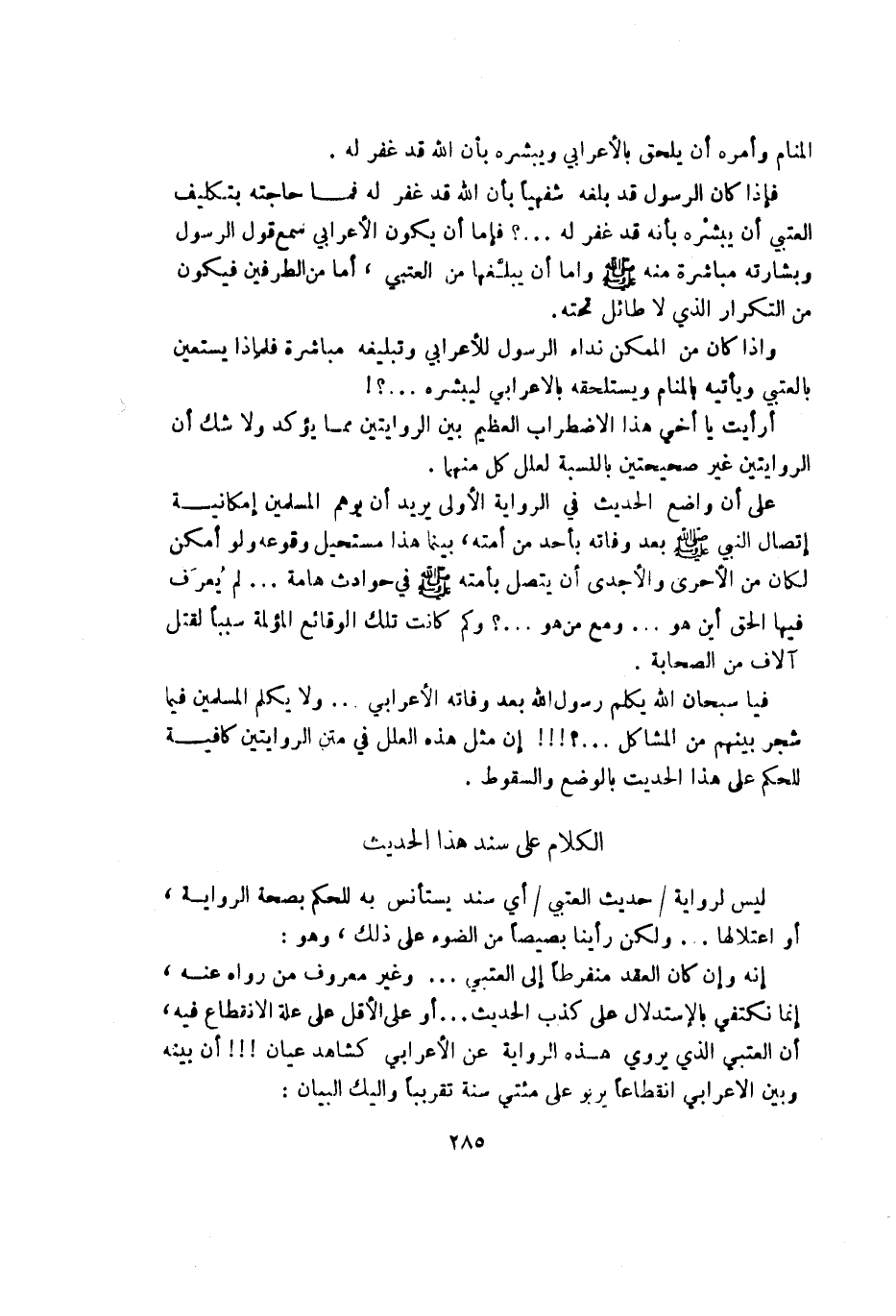 وإذا كان من الممكن نداء الرسول للأعرابي وتبليغه مباشرة فلماذا يستعين بالعتبي ويأتيه بالمنام ويستلحقه بالأعرابي ليبشره ... ؟!