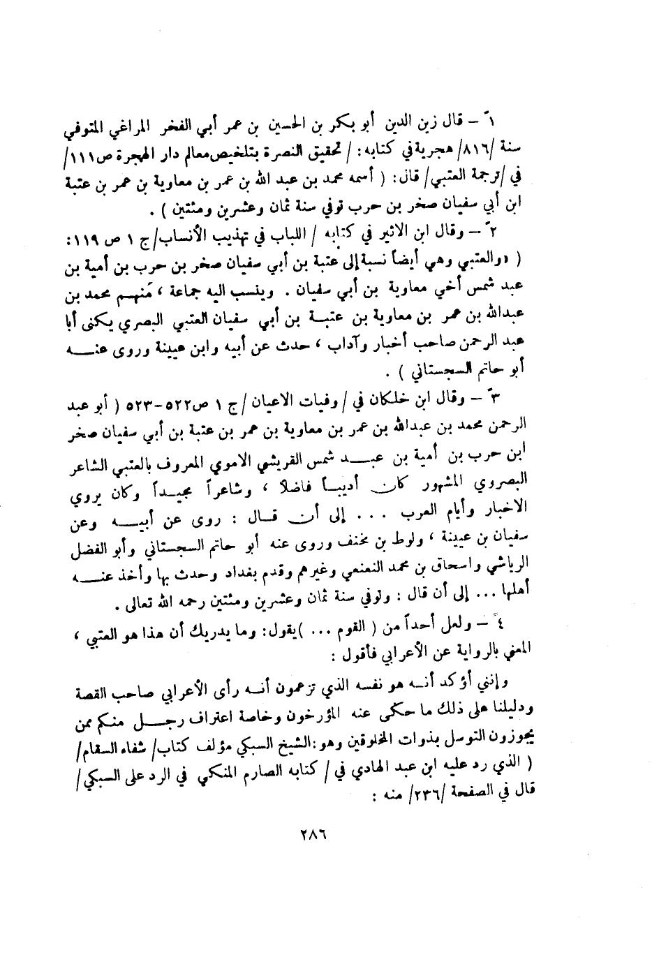 1 - قال زين الدين أبو بكر بن الحسين بن عمر أبى الفخر المراغي المتوفي سنة / 816 / هجرية: تحقيق النصرة بتلخيص معالم دار الهجرة ص 111 / في / ترجمة العتبي / قال: (أسمه محمد بن عبد الله بن عمر بن معاوية بن عمر بن عتبة أبن أبي سفيان صخر بن حرب توفي سنة ثمان وعشرين ومائتين).