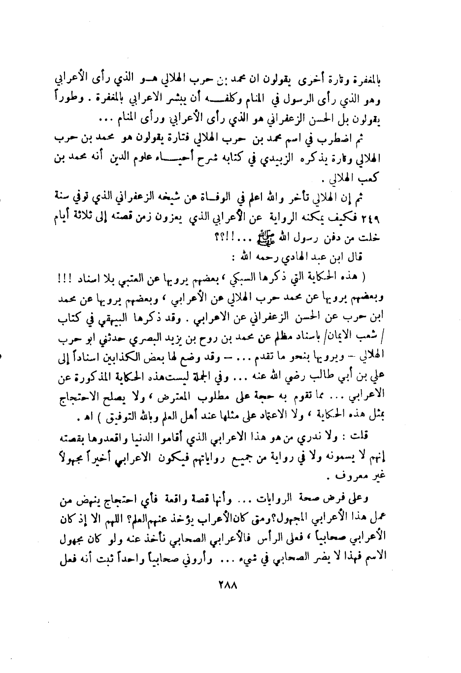 بالمغفرة وتارة أخرى يقولون أن محمد بن حرب الهلالي هو الذي رأى الأعرابي وهو الذي رأى الرسول في المنام وكلفه أن يبشر الأعرابي بالمغفرة. وطوراً يقولون بل الحسن الزعفراني هو الذي رأى الأعرابي ورأى المنام ...