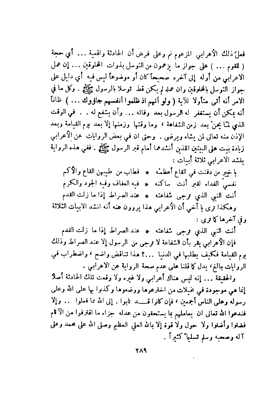 فعل ذلك الأعرابي المزعوم ثم وعلى فرض أن الحادثة واقعية ... أى حجة (للقوم ... ) على جواز ما يزعمون من التوسل بذوات المخلوقين ... إن عمل الأعرابي من أوله إلى آخره صحيحاً كان أو موضوعاً ليس فيه أى دليل على جواز التوسل بالمخلوقين وإن عمله لم يكن قط توسلاً بالرسول - صلى الله عليه وسلم -. وكل ما في الآمر أنه أتى تأولا للآية (ولو أنهم إذ ظلموا أنفسهم جاؤوك ... ) ظاناً أنه يمكن أن يستغفر له الرسول بعد وفاته ... وأن يشفع له ... في الوقت الذي لما يحن بعد زمن الشفاعة، وما وقتها وزمنها إلا بعد يوم القيامة وبعد الإذن منه تعالى لمن يشاء ويرضى. وحق أن في بعض الروايات عن الأعرابي زيادة بيت على البيتين اللذين أنشدهما أمام قبر الرسول - صلى الله عليه وسلم -. ففي هذه الرواية ينشد الأعرابي ثلاثة أبيات: