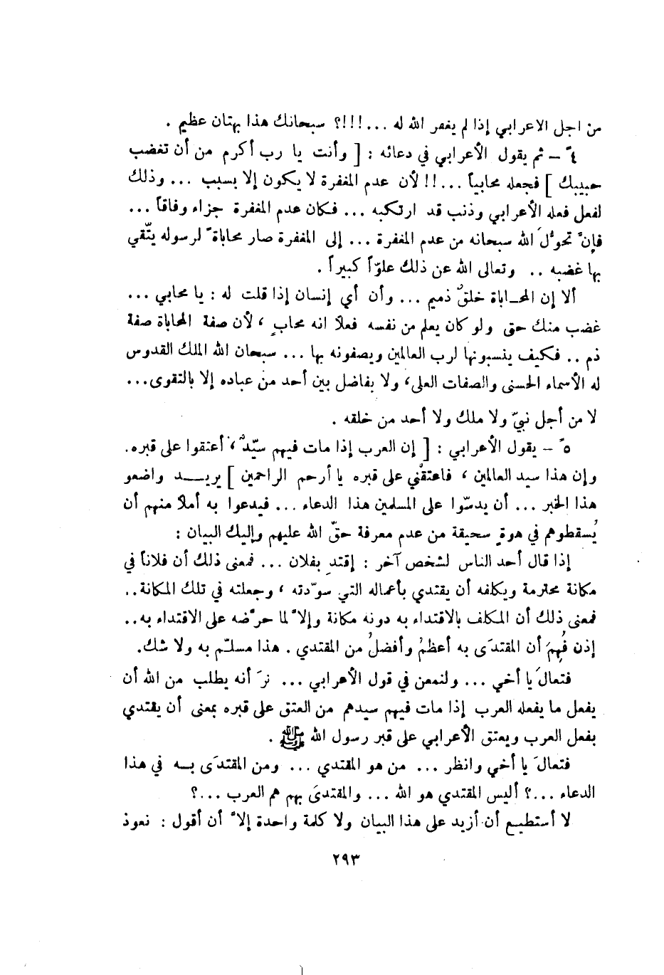 5 - يقول الأعرابي: [إن العرب إذا مات فيهم سيد، أعتقوا على قبره. وإن هذا سيد العالمين، فأعتقني على قبره يا أرحم الراحمين] يريد واضعو هذا الخبر ... أن يدسوا على المسلمين هذا الدعاء .. فيدعوا به أملاً منهم أن يسقطوهم في هوة سحيقة من عدم معرفة حق الله عليهم وإليك البيان: