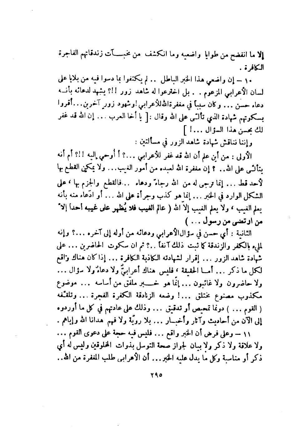 الثانية: أي حسن في سؤال الأعرابي ودعائه من أوله إلى آخره ... ؟ وإنه لمليء بالكفر والزندقة كما ثبت ذلك آنفاً؟ ثم إن سكوت الحاضرين على شهادة شاهد الزور إقرار لشهادته الكاذبة الكافرة إذا كان هناك واقع لكل ما ذكر أما الحقيقة فليس هناك أعرابي ولا دعاء ولا سؤال ولا حاضرون ولا غائبون إنما هو خبر ملفق من أساسه موضوع مكذوب مصنوع مختلق وضعه الزنادقة الكفرة الفجرة وتلقفه (القوم ... ) دونما تمحيص أو تدقيق ... وذلك على عادتهم في كل ما أوردوه إلى الآن من أحاديث وآثار وأخبار بلا روية ولا فهم هدانا الله وإياهم.