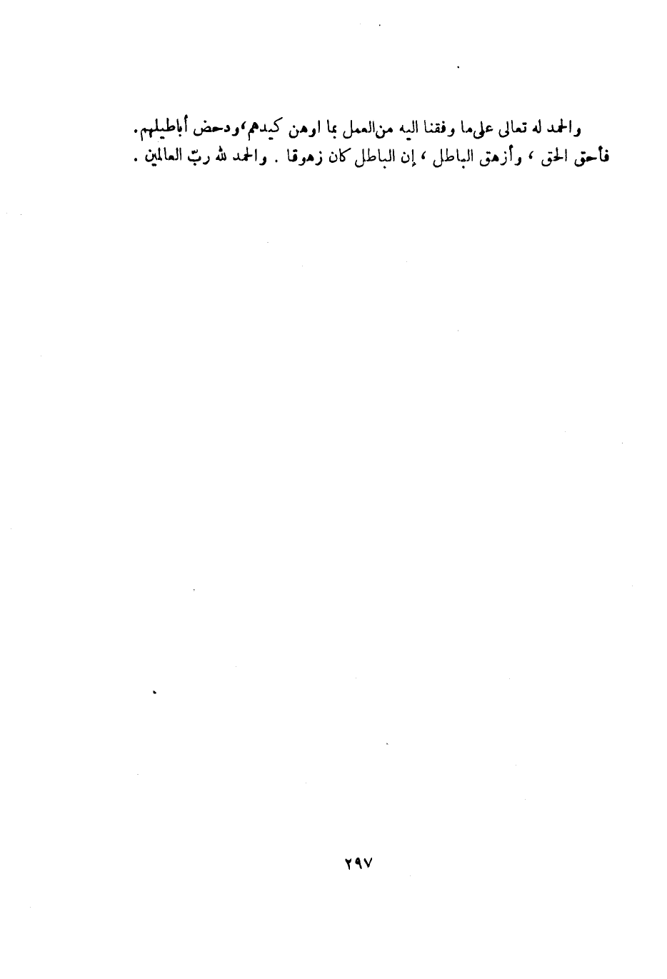 والحمد له تعالى على ما وفقنا إليه من العمل بما أوهن كيدهم ودحض أباطيلهم فأحق الحق وأزهق الباطل إن الباطل كان زهوقاً والحمد لله رب العالمين.