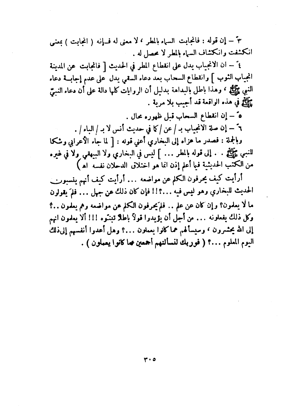 وبالجملة: فصدر ما عزاه إلى البخاري أعني قوله: [لما جاء الأعرابي وشكا للنبي - صلى الله عليه وسلم - إلى قوله بالمطر ... ] ليس في البخاري ولا البيهقي ولا في غيره من الكتب الحديثية فيما أعلم إذن إنما هو اختلاق الدحلان نفسه اهـ)
