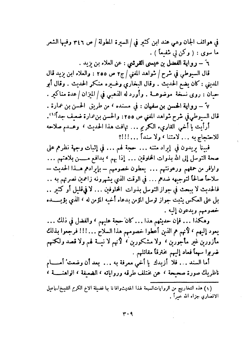 7 - رواية الحسن بن سفيان: في مسنده من طريق الحسن بن عمارة. قال السيوطي في شرح شواهد المغني ص255: والحسن بن عمارة ضعيف جداً (¬1) أرأيت يا أخي القارئ الكريم تهافت هذا الحديث وعدم صلاحه للاحتجاج به ... لا متناً ولا سنداً ... !!!؟