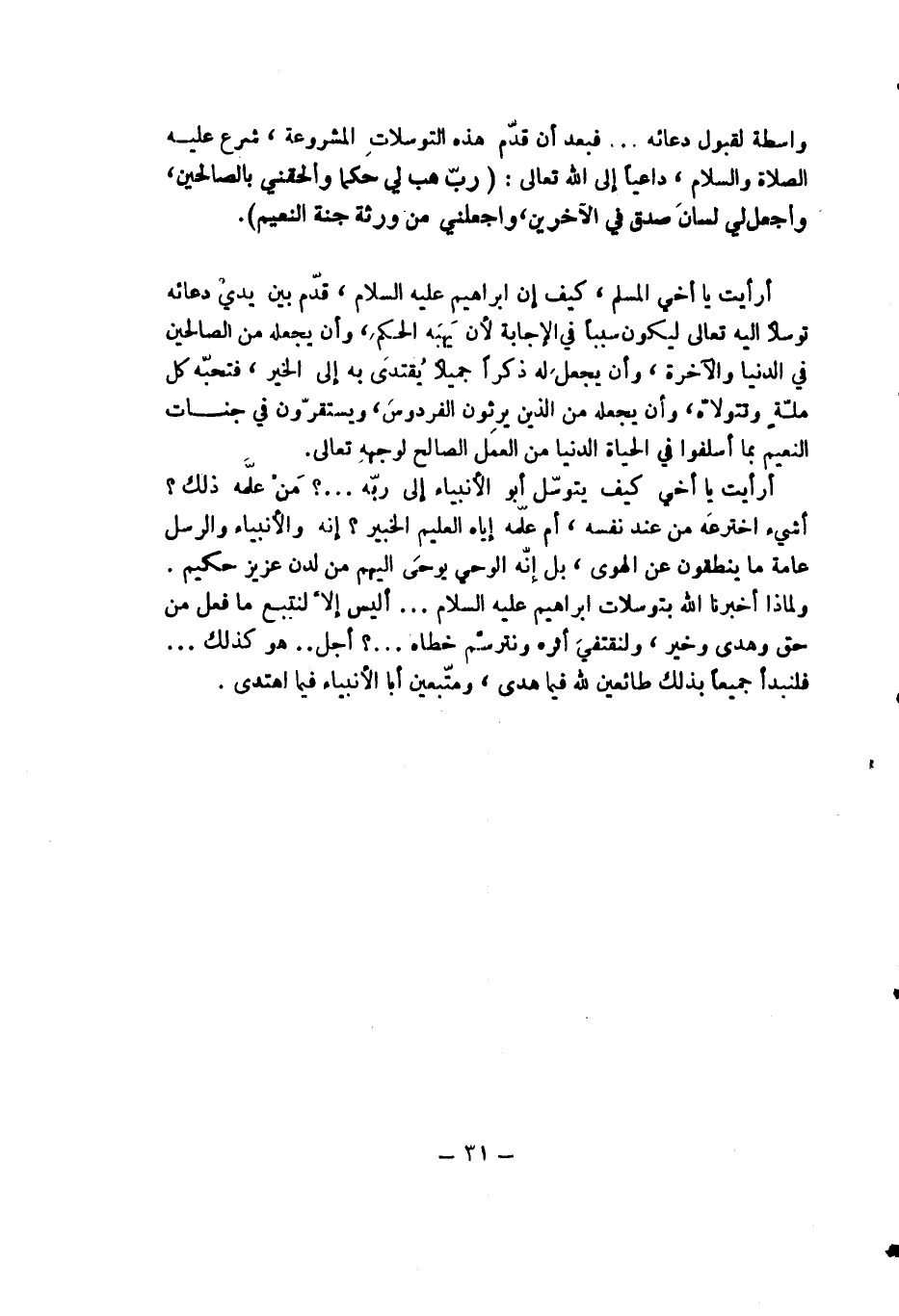 أرأيت يا أخي كيف يتوسل أبو الأنبياء إلى ربه ... ؟ من علمه ذلك؟ أشيء اخترعه من عند نفسه أم علمه إياه العليم الخبير؟ إنه والأنبياء والرسل عامة ما ينطقون عن الهوى بل الوحي يوحى إليهم من لدن عزيز حكيم. ولماذا أخبرنا الله بتوسلات إبراهيم عليه السلام ... أليس إلا لنتبع ما فعل من حق وهدى وخير ولنقتفى أثره ونترسم خطاه ... ؟ أجل .. هو كذلك ... فلنبدأ جميعاً بذلك طائعين لله فيما هدى ومتبعين أبا الأنبياء فيما اهتدى.