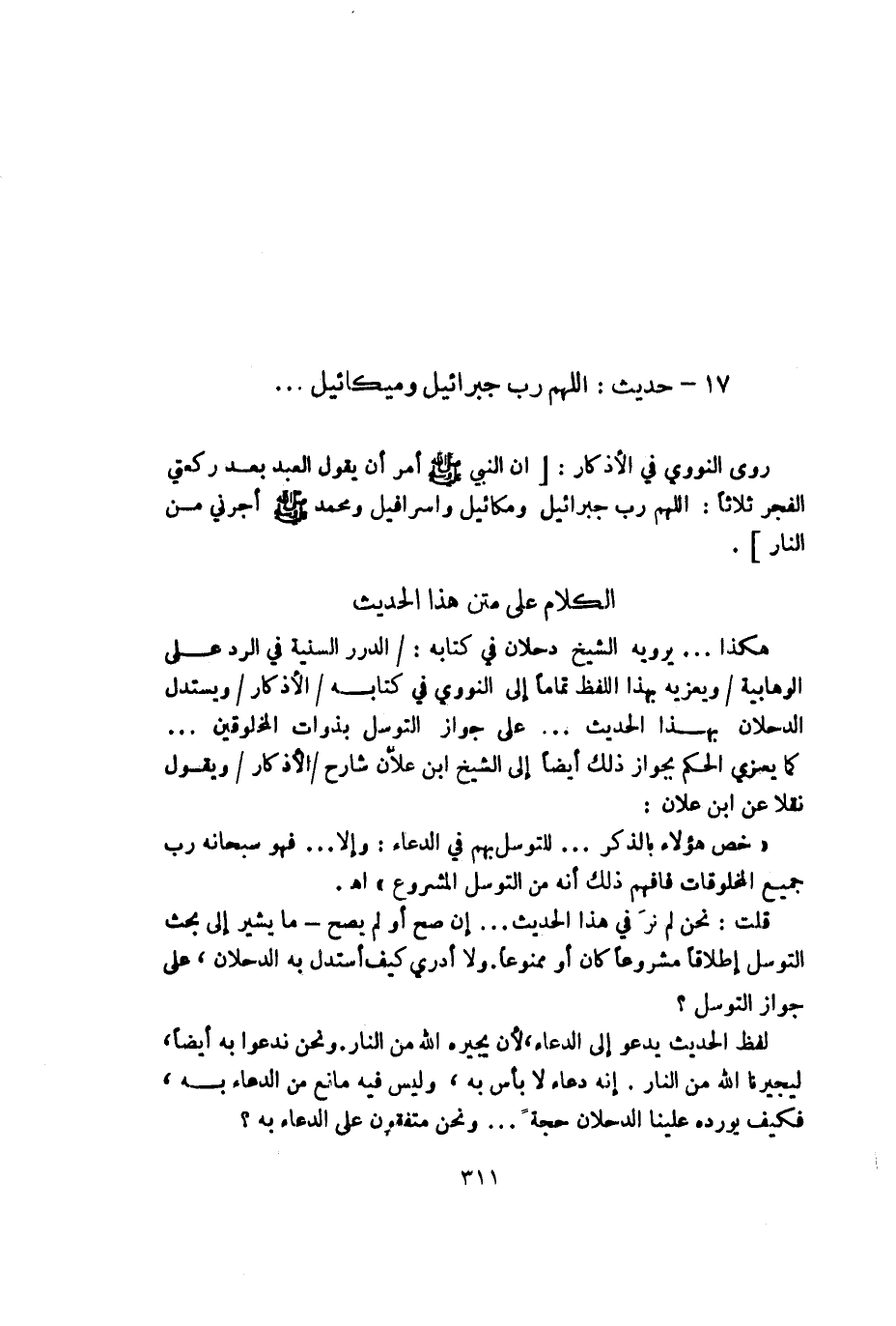 قلت: نحن لم نر في هذا الحديث عن صح أو لم يصح - ما يشير إلى بحث التوسل إطلاقاً مشروعاً أو ممنوعاً ولا أدري كيف أستدل به الدحلان على جواز التوسل؟