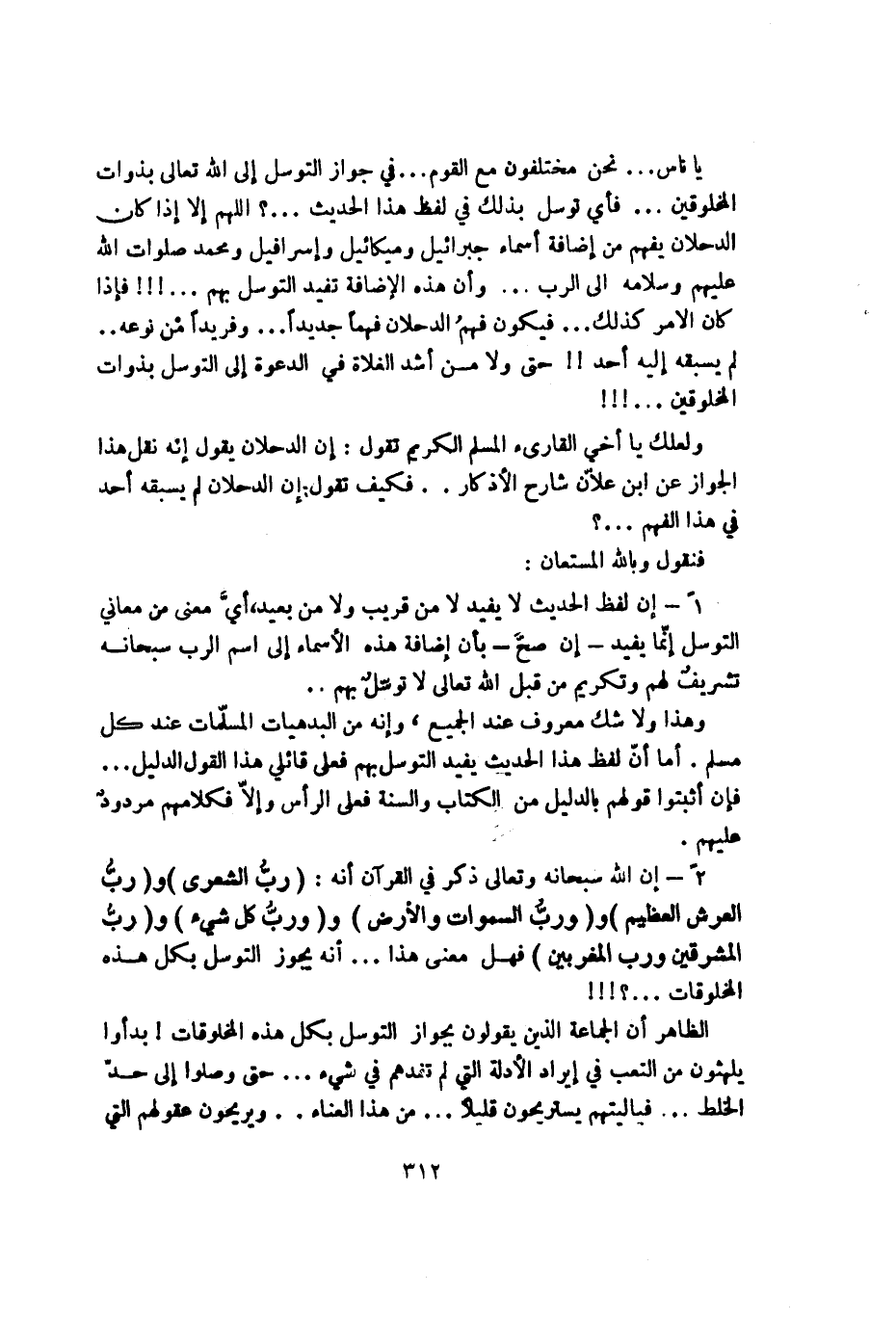 يا ناس نحن مختلفون مع القوم في جواز التوسل إلى الله تعالى بذوات المخلوقين فأي توسل بذلك في لفظ هذا الحديث ... ؟ اللهم إلا إذا كان الدحلان يفهم من إضافة أسماء جبرائيل وميكائيل وإسرافيل ومحمد صلوات الله عليهم وسلامه إلى الرب وأن هذه الإضافة تفيد التوسل بهم!!! فإذا كان الأمر كذلك فيكون فهم الدحلان فهماً جديداً وفريداً من نوعه لم يسبقه إليه أحد!!! وفريداً من نوعه لم يسبقه إليه أحد!! حتى ولا من أشد الغلاة في الدعوة إلى التوسل بذوات المخلوقين!!!