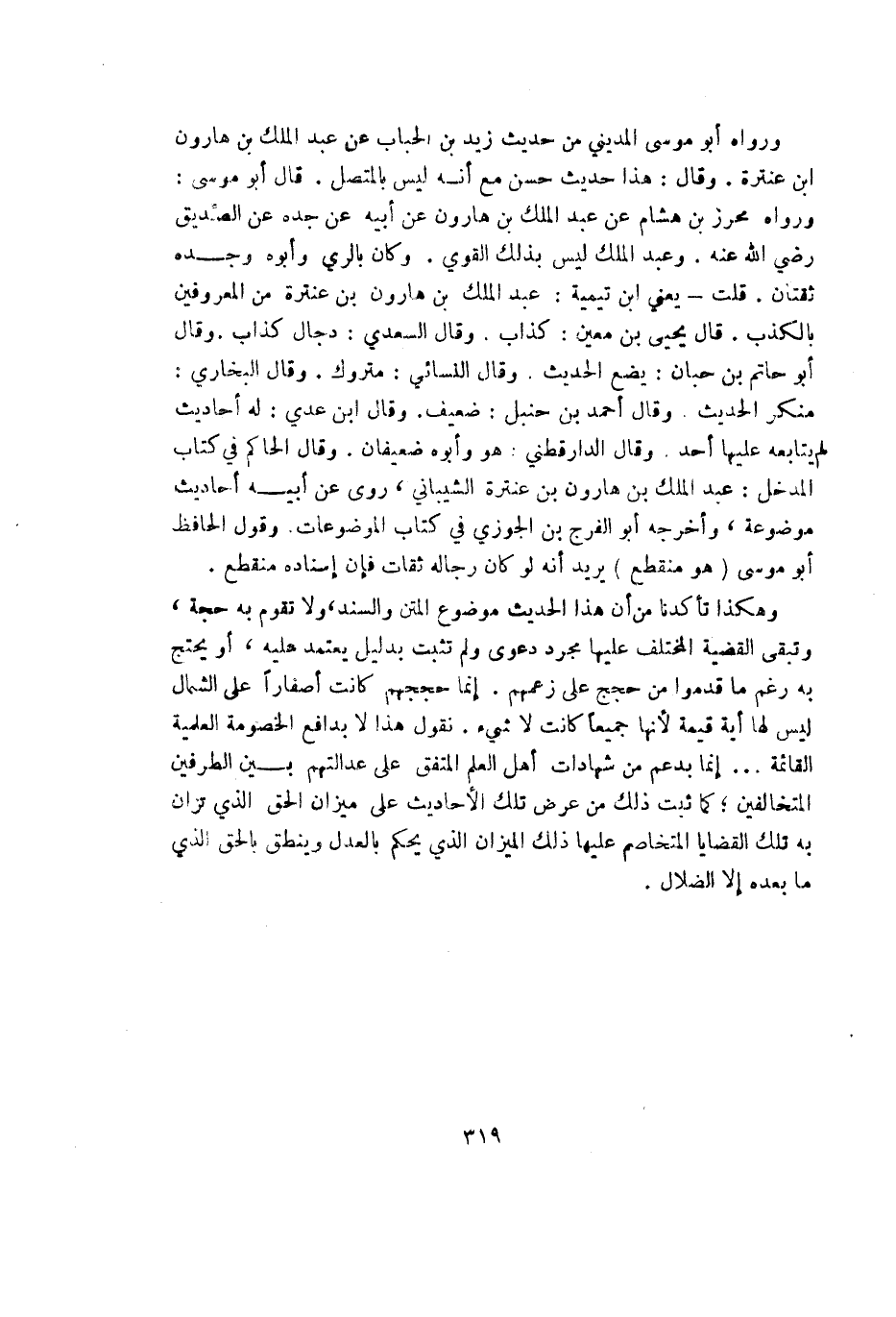 ورواه أبو موسى المديني من حديث زيد بن الحباب عن عبد الملك بن هارون ابن عنترة وقال: هذا حديث حسن مع أنه ليس بالمتصل قال أبو موسى: ورواه محرز بن هشام عن عبد الملك بن هارون عن أبيه عن جده عن الصديق - رضي الله عنه - وعبد الملك ليس بذلك القوي وكان بالري وأبوه وجده ثقتان قلت - يعني ابن تيمية: عبد الملك بن هارون بن عنترة من المعروفين بالكذب قال يحيى بن معين: كذاب. وقال السعدي: دجال كذاب. وقال أبو حاتم بن حبان: يضع الحديث وقال النسائي: متروك. وقال البخاري: منكر الحديث. وقال أحمد بن حنبل: ضعيف. وقال ابن عدي: له أحاديث لم يتابعه عليها أحد. وقال الدارقطني: هو وأبوه ضعيفان. وقال الحاكم في كتاب المدخل: عبد الملك بن هارون بن عنترة الشيباني روى عن أبيه أحاديث موضوعة وأخرجه أبو الفرج بن الجوزي في كتاب الموضوعات وقول الحافظ أبو موسى (هو منقطع) يريد أنه لو كان رجاله ثقات فإن إسناده منقطع.