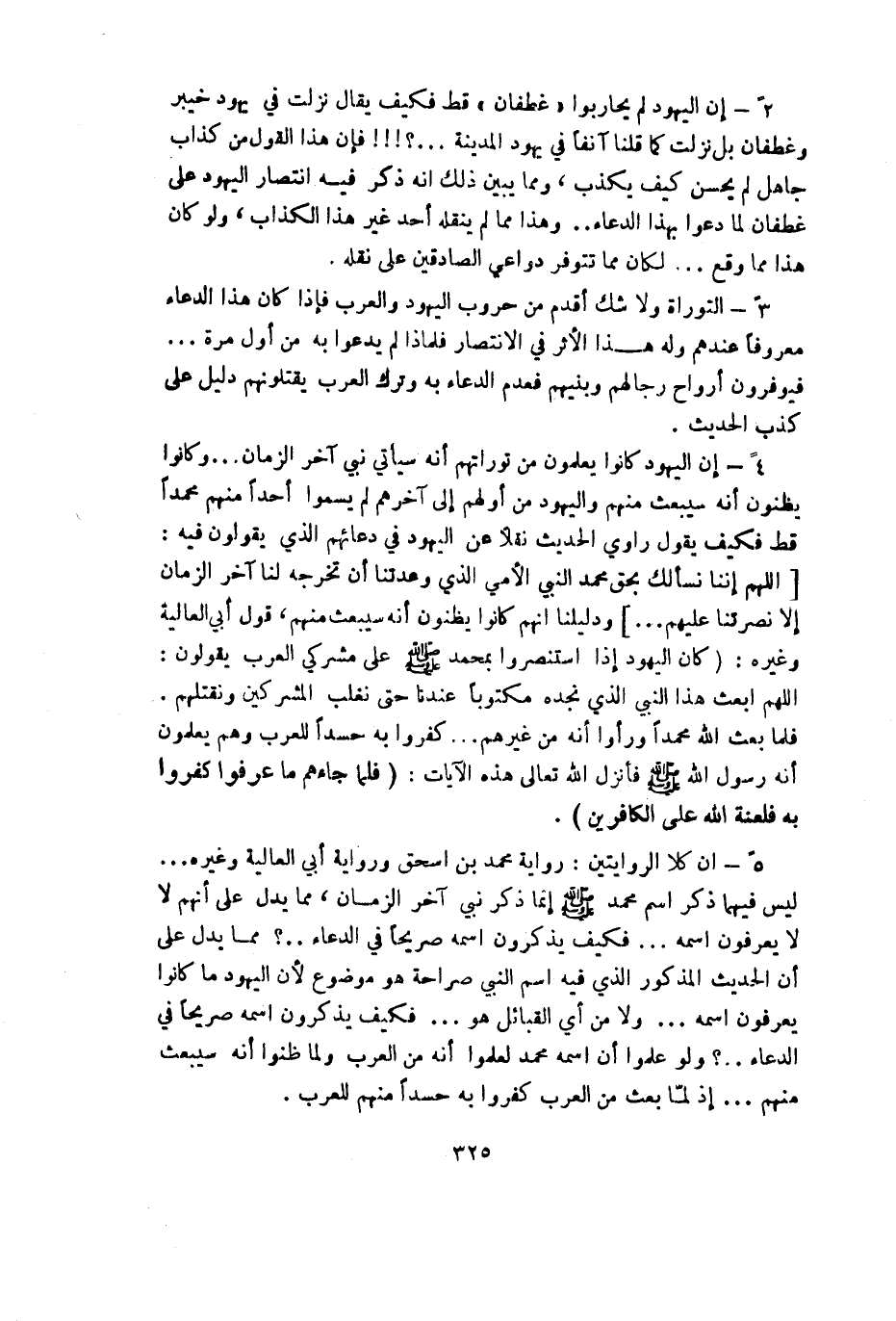 4 - إن اليهود كانوا يعلمون من توراتهم أنه سيأتي نبي آخر الزمان وكانوا يظنون أنه سيبعث منهم واليهود من أولهم إلى آخرهم لم يسموا أحداً منهم محمداً قط فكيف يقول راوي الحديث نقلاً عن اليهود في دعائهم الذي يقولون فيه: [اللهم إننا نسألك بحق محمد النبي الأمي الذي وعدتنا أن تخرجه لنا آخر الزمان إلا نصرتنا عليهم ... .] ودليلنا انهم كانوا يظنون أنه سيبعث منهم قول أبو العالية وغيره: (كان اليهود إذا استنصروا بمحمد - صلى الله عليه وسلم - على مشركين العرب يقولون: اللهم ابعث هذا النبي الذي نجده مكتوباً عندنا حتى نغلب المشركين ونقتلهم فلما بعث الله محمداً ورأوا أنه من غيرهم كفروا به حسداً للعرب وهم يعلمون أنه رسول الله - صلى الله عليه وسلم - فأنزل الله تعالى هذه الآيات: (فلما جاءهم ما عرفوا كفروا به فلعنة الله على الكافرين).