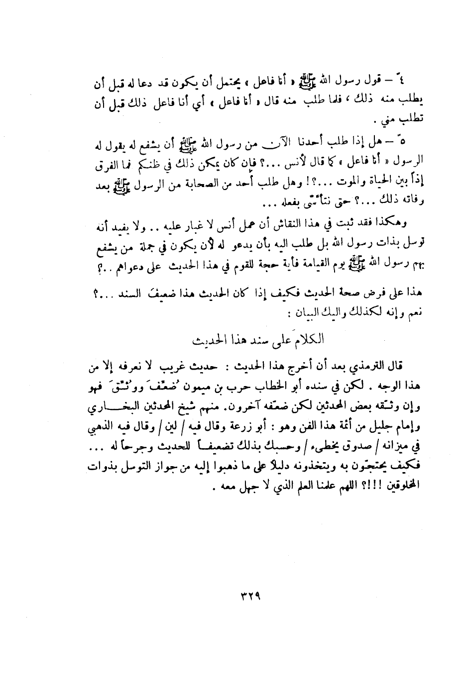 وهكذا فقد ثبت في هذا النقاش أن عمل أنس لا غبار عليه ولا يفيد أنه توسل بذات رسول الله بل طلب إليه بأن يدعو له لأن يكون في جملة من يشفع بهم رسول الله - صلى الله عليه وسلم - يوم القيامة فأية حجة للقوم في هذا الحديث على دعواهم؟ هذا على فرض صحة الحديث فكيف إذا كان الحديث هذا ضعيف السند؟ نعم وإنه لكذلك وإليك البيان: