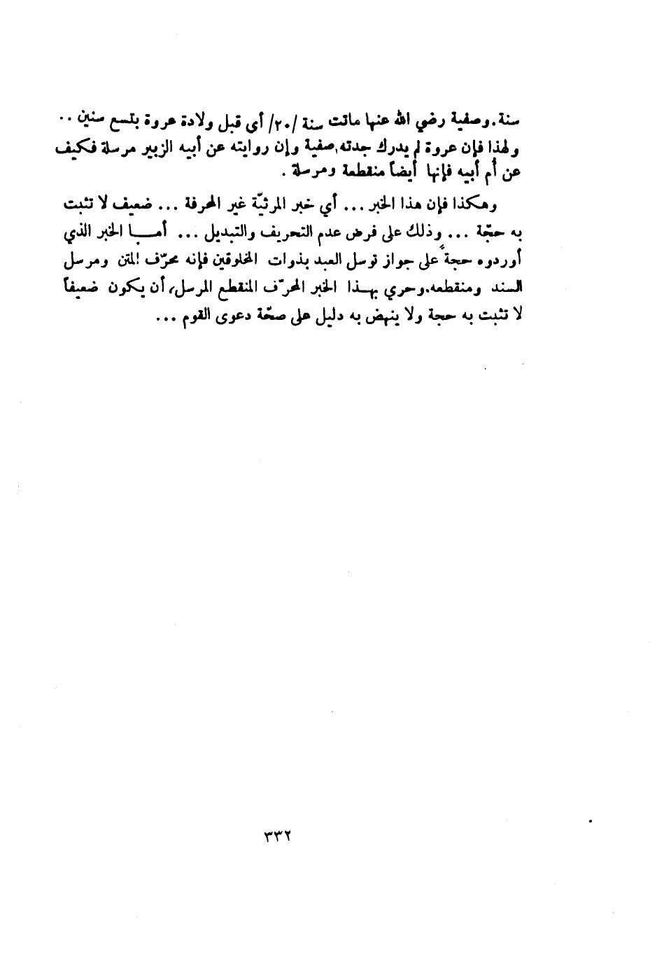 سنة وصفية رضي الله عنها ماتت سنة /20/أي قبل ولادة عروة بتسع سنين ولهذا فإن عروة لم يدرك جدته صفية وإن روايته عن أبيه مرسلة فكيف عن أم أبيه فإنها أيضاً منقطعة ومرسلة.