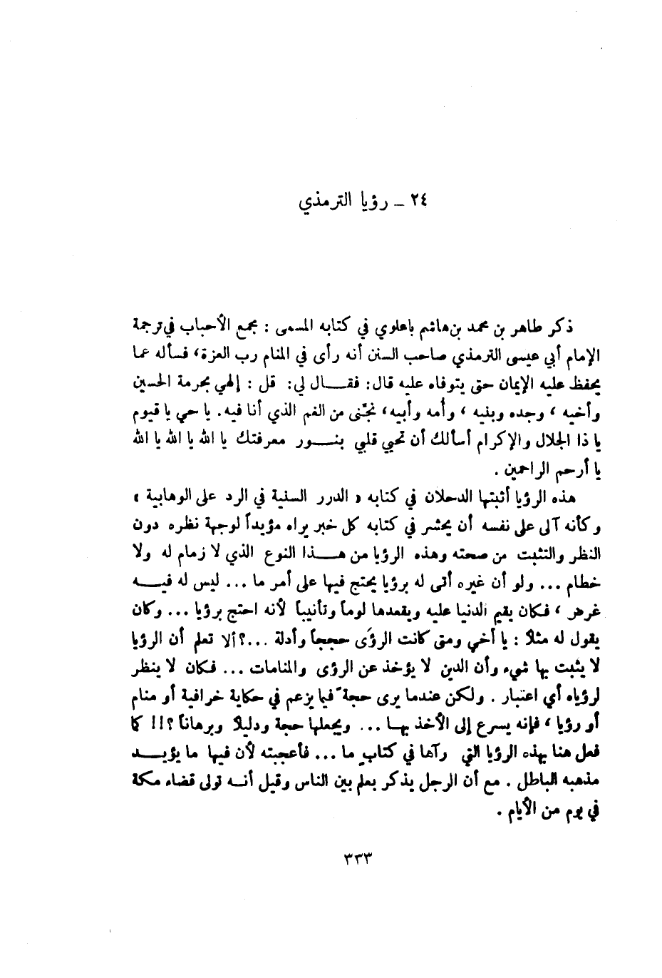 هذه الرؤيا أثبتها الدحلان في كتابه ((الدرر السنية في الرد على الوهابية)) وكأنه آلى على نفسه أن يحشر في كتابه كل خبر يراه مؤيداً لوجهة نظره دون النظر والتثبت من صحته وهذه الرؤيا من هذا النوع الذي لا زمام له ولا خطام ولو أن غيره أتى له برؤيا يحتج فيها على أمر ما ليس له فيه غرض فكان يقيم الدنيا عليه ويقعدها لوماً وتأنيبا لأنه احتج برؤيا وكان يقول له مثلاً: يا أخي ومتى كانت الرؤى حججاً وأدلة؟ ألا تعلم أن الرؤيا لا يثبت بها شيء وأن الدين لا يؤخذ عن الرؤى والمنامات فكان لا ينظر أي اعتبار ولكن عندما يرى حجة فيما يزعم في حكاية خرافية أو منام أو رؤيا فإنه يسرع إلى الأخذ بها ويجعلها حجة ودليلاً وبرهاناً؟ كما فعل هنا بهذه الرؤيا التي رآها في كتاب ما فأعجبته لأن فيها ما يؤيد مذهبه الباطل مع أن الرجل يذكر بعلم الناس وقيل أنه تولى قضاء مكة في يوم من الأيام.