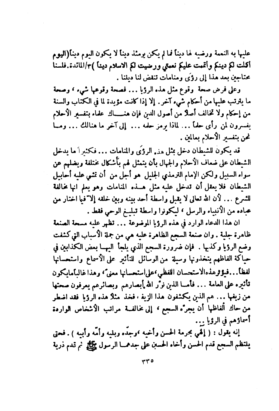 عليها به النعمة ورضيه لها ديناً فما لم يكن يومئذ ديناً لا يكون اليوم ديناً (اليوم أكملت لكم دينكم وأتمت عليم\كم نعمتي ورضيت لكم الإسلام ديناً) 3/المائدة. فلسنا محتاجين بعد هذا إلى رؤى ومنامات تنقض لنا ديننا.