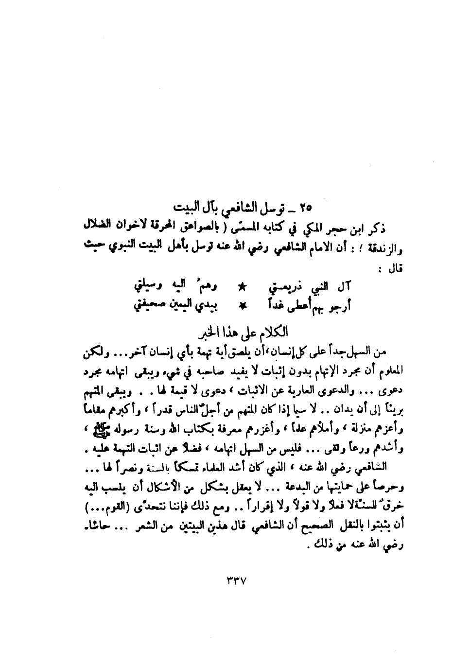 ذكر ابن حجر الملكي في كتابه المسمى (بالصواعق المحرقة لإخوان الضلال والزندقة): أن الإمام الشافعي - رضي الله عنه - توسل بأهل البيت النبوي حيث قال: