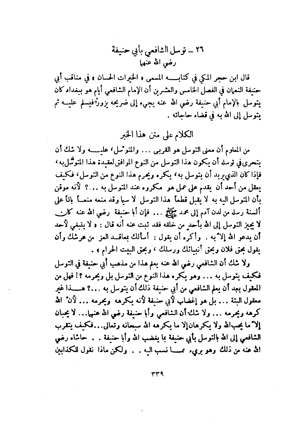 قال ابن حجر المكي في كتابه المسمى ((الخيرات الحسان)) في مناقب أبي حنيفة النعمان في الفصل الخامس والعشرين أن الإمام الشافعي أيام هو ببغداد كان يتوسل بالإمام أبي حنيفة - رضي الله عنه - يجيء إلى ضريحه يزوره فيسلم عليه ثم يتوسل إلى الله به في قضاء حاجاته.