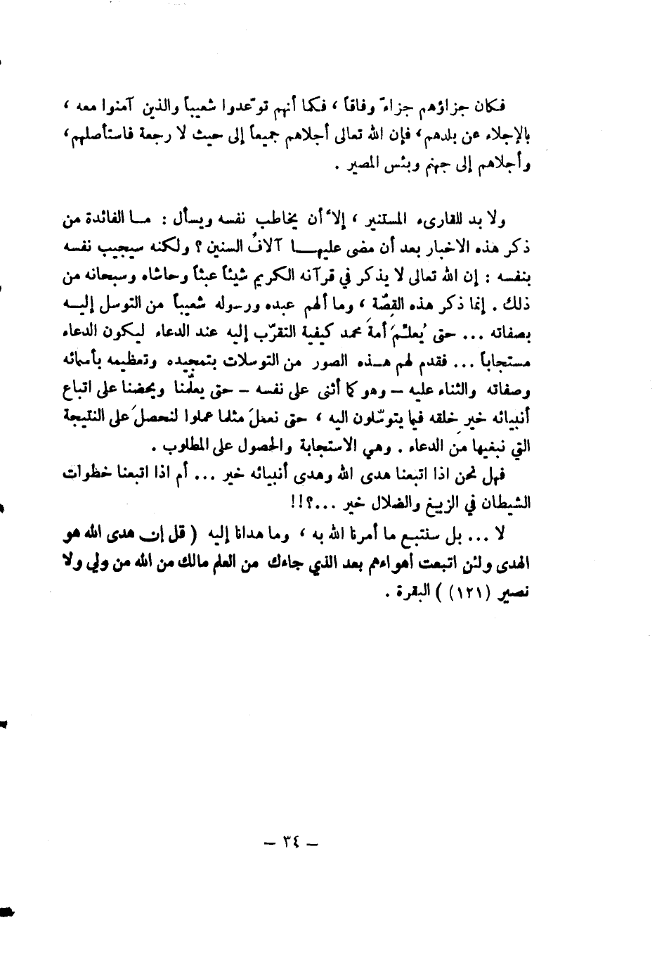 ولا بد للقارئ المستنير إلا أن يخاطب نفسه ويسأل: ما الفائدة من ذكر هذه الأخبار بعد أن مضى عليها آلاف السنين؟ ولكنه سيجيب نفسه بنفسه: إن الله تعالى لا يذكر في قرآنه الكريم شيئاً عبثاً وحاشاه وسبحانه من ذلك إنما ذكر هذه القصة وما ألهم عبده ورسوله شعيباً من التوسل إليه بصفاته ... حتى يعلم أمة محمد كيفية التقرب إليه عند الدعاء ليكون الدعاء مستجاباً ... فقدم لهم هذه الصور من التوسلات بتمجيده، وتعظيمه بأسمائه وصفاته والثناء عليه - وهو كما أثنى على - - حتى يعلمنا ويحضنا على أتباع أنبيائه خير خلقه فيما يتوسلون إليه حتى نعمل مثلما عملوا لنحصل على النتيجة التي نبغيها من الدعاء. وهي الاستجابة والحصول على المطلوب.