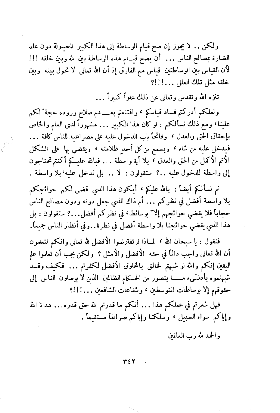 ولكن لا يجوز إن صح قيام الوساطة إلى هذا الكبير للحيلولة دون علله الضارة بمصالح الناس أن يصح قيام هذه الوساطة بين الله وبين خلقه لأن القياس بين الوساطتين قياس مع الفارق إذ أن الله تعالى لا تحول بينه وبين خلقه مثل تلك العلل!!؟