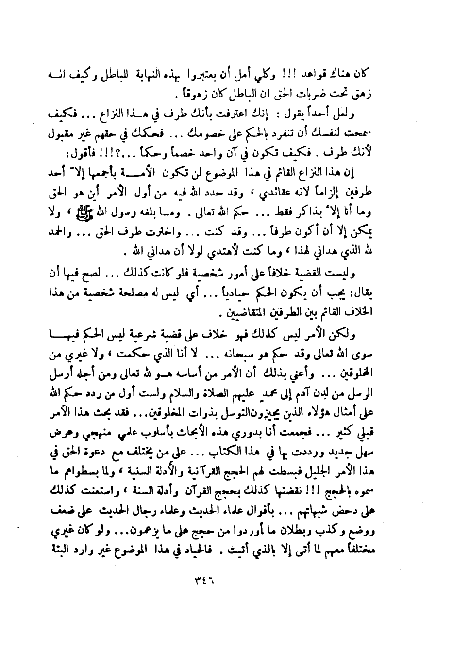 ولكن الأمر ليس كذلك فهو على قضية شرعية ليس الحكم فيها سوى الله تعالى وقد حكم هو سبحانه لا أنا الذي حكمت ولا غيري من المخلوقين وأعني بذلك أن الأمر من أساسه هو الله تعالى ومن أجله أرسل من لدن آدم إلى محمد عليهم الصلاة والسلام ولست أول من ردد حكم الله على أمثال هؤلاء الذين يجيزون التوسل بذوات المخلوقين فقد بحث هذا الأمر قبلي كثير فجمعت أنا بدوري هذه الأبحاث بأسلوب علمي ومنهجي وعرض سهل جديد ورددت بها في هذا الكتاب على من يختلف مع دعوة الحق في هذا الأمر الجليل فبسطت لهم الحجج القرآنية والأدلة السنية ولما بسطواهم ما سموه بالحجج نقضتها كذلك بحجج القرآن وأدلة السنة واستعنت كذلك على دحض شبهاتهم بأقوال علماء الحديث وعلماء رجال الحديث على ضعف ووضع وكذب وبطلان ما أوردوا من حجج على ما يزعمون ولو كان غيري مختلفاً معهم لما أتى إلا بالذي أتيت فالحياد في هذا الموضوع غير وادر البتة
