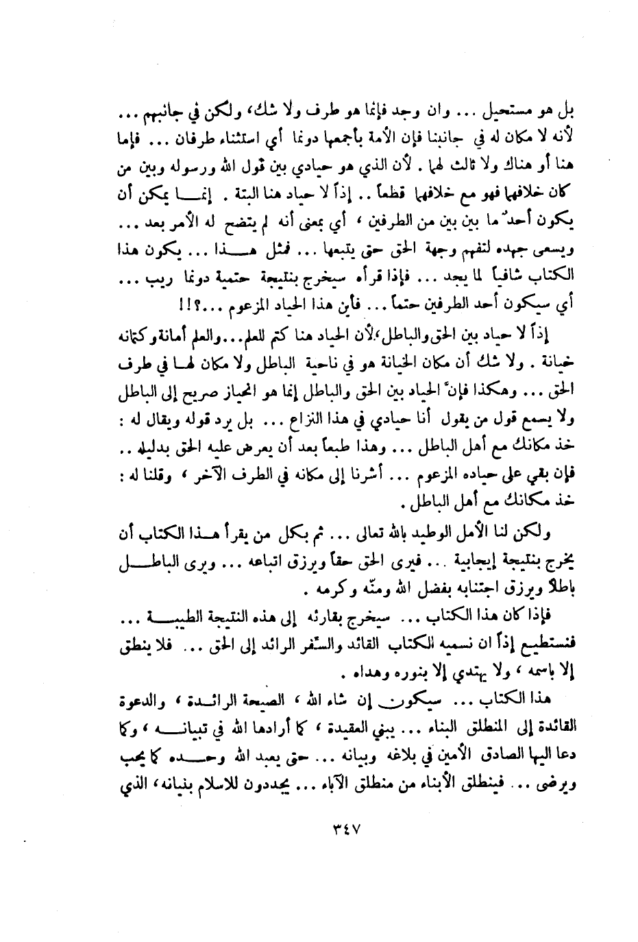 بل هو مستحيل وإن وجد فإنما هو طرف ولا شك ولكن في جانبهم لأنه لا مكان له في جانبنا فإن الأمة بأجمعها دونما أي استثناء طرفان فإن هنا أو هناك ولا ثالث لهما لأن الذي هو حيادي بين قول الله ورسوله وبين من كان خلافهما فهو مع خلافهما قطعاً إذاً لا حياد هنا البتة إنما يمكن أن يكون أحد ما بين بين الطرفين أي بمعنى أنه لم يتضح له الأمر بعد ويسعى جهده لتفهم وجهة الحق حتى تبعها فمثل هذا يكون هذا الكتاب شافياً لما يجد فإذا قرأه سيخرج بنتيجة حتمية دونما ريب أي سيكون أحد الطرفين حتماً فأين هذا الحياد المزعوم؟!!!