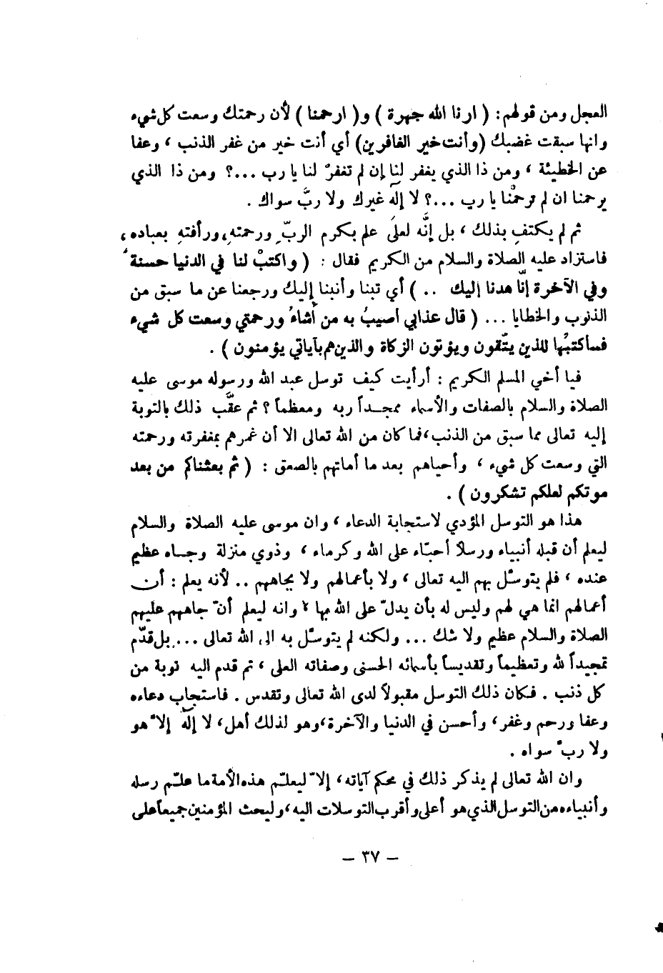 هذا هو التوسل المؤدي لاستجابة الدعاء وأن موسى عليه الصلاة والسلام ليعلم قبله أنبياء ورسلاً أحباء على الله كرماء وذوي منزلة وجاء عظيم عنده فلم يتوسل بهم إليه تعالى ولا بأعمالهم ولا بجاههم .. لأنه يعلم: أن أعمالهم إنما هي لهم وليس له بأن يدل على الله بها وأنه ليعلم أن جاههم عليهم الصلاة والسلام عظيم ولا شك ... ولكنه لم يتوسل به إلى الله تعالى ... بل قدم تمجيداً لله وتعظيماً وتقديساً بأسمائه الحسنى وصفاته العلى ثم قدم إليه توبة من كل ذنب. فكان ذلك التوسل مقبولاً لدى الله تعالى وتقدس فاستجاب دعاءه وعفا ورحم وغفر وأحسن في الدنيا والآخرة وهو لذلك أهل لا إله إلا هو ولا رب سواه.
