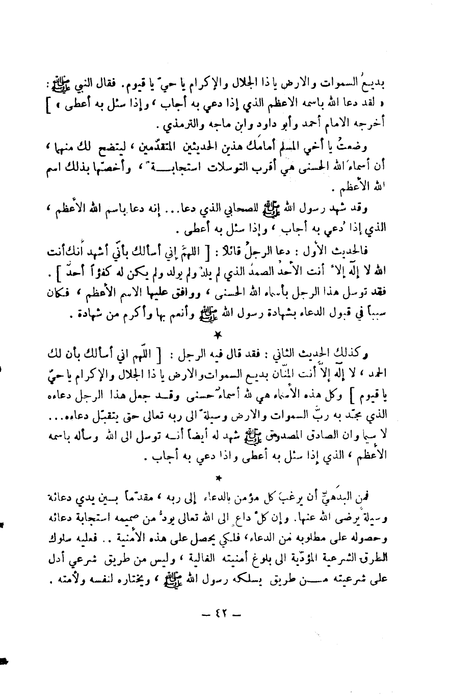 بديع السموات والأرض يا ذا الجلال والإكرام يا حي يا قيوم] وكل هذه الأسماء هي أسماء حسنى وقد جعل هذا الرجل دعاءه الذي مجد به رب السموات والأرض وسيلة إلى ربه تعالى حتى يتقبل دعاءه ... لا سيما وأن الصادق المصدوق - صلى الله عليه وسلم - شهد له أيضاً أنه توسل إلى الله وسأله باسمه الأعظم الذي إذا سئل به أعطي وإذا دعي به أجاب.
