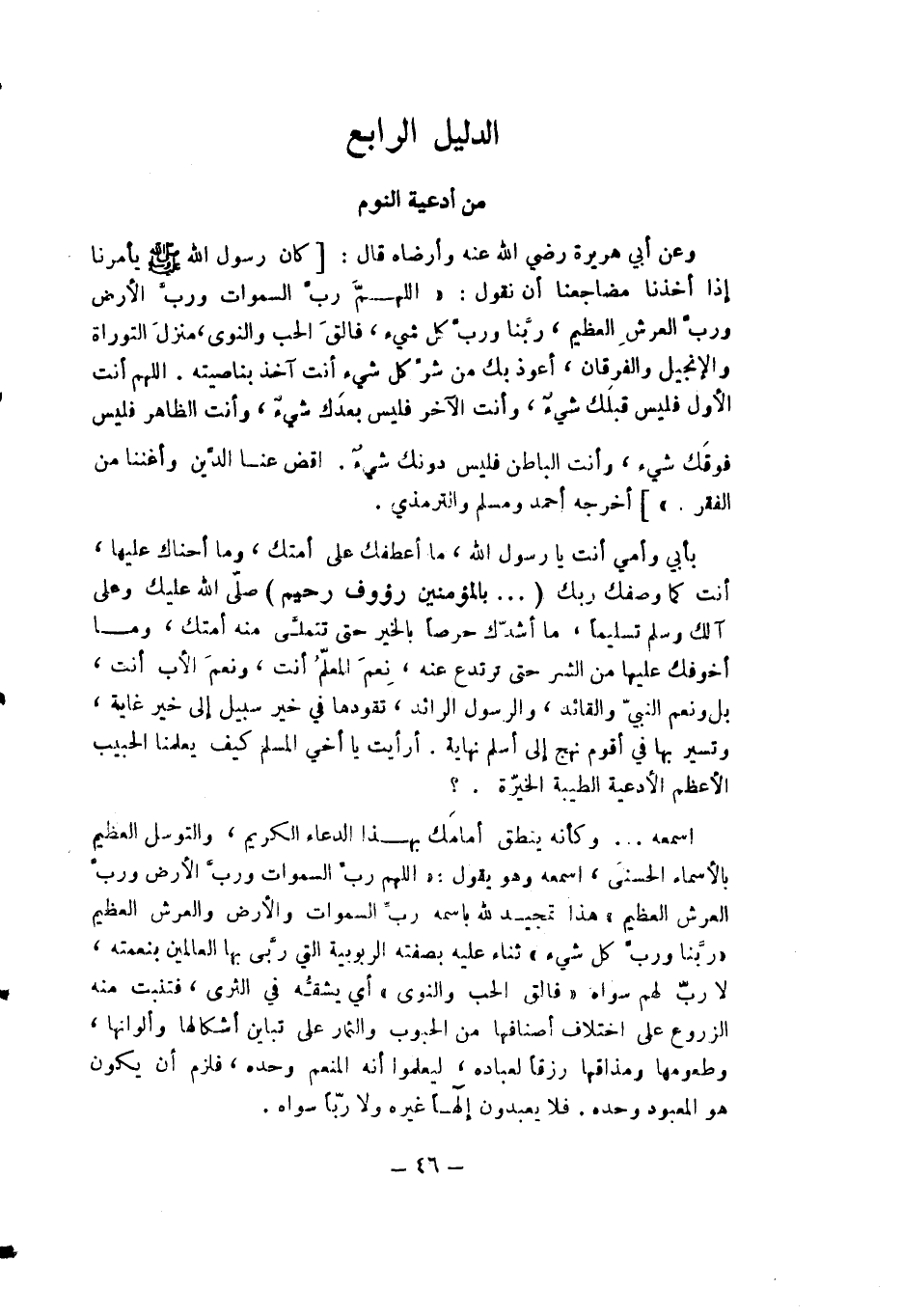 وعن أبي هريرة - رضي الله عنه - وأرضاه قال: [كان رسول الله - صلى الله عليه وسلم - يأمرنا إذا أخذنا مضجعنا أن نقول: ((اللهم رب السموات ورب الأرض ورب العرش العظيم ربنا ورب كل شيء فالق الحب والنوى منزل التوراة والإنجيل والفرقان أعوذ بك من شر كل شيء أنت آخذ بناصيته. اللهم أنت الأول فليس قبلك شيء وأن الآخر فليس بعدك شيء وأنت الطاهر فليس فوقك شيء وأنت الباطن فليس دونك شيء اقض عنا الدين وأغننا من الفقر))] أخرجه أحمد ومسلم والترمذي.