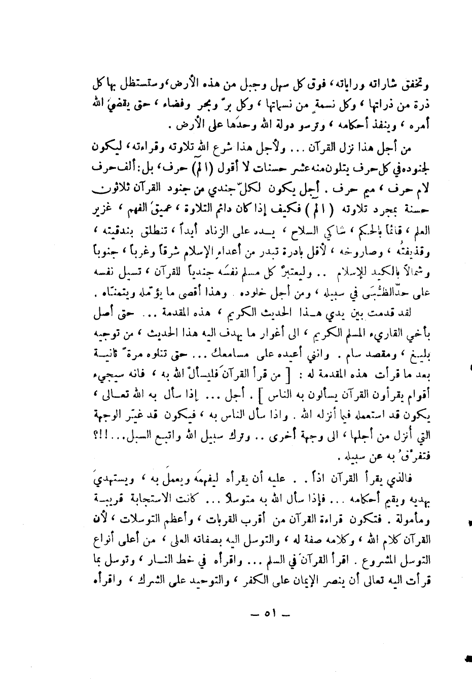 من أجل هذا نز القرآن ... ولأجل هذا شرع الله تلاوته وقراءته ليكون لجنوده في كل حرف يتلون منه عشر حسنات لا أقول (الم) حرف، بل: ألف حرف لام حرف ميم حرف أجل يكون لكل جندي من جنود القرآن ثلاثون حسنة بمجرد تلاوته (الم) فكيف إذا كان دائم التلاوة عميق الفهم غزير العلم قائماً بالحكم شاكي السلاح يده على الزناد أيداً تنطلق بندقيته وقذيفته وصاروخه لأقل بادرة تبدر من أعداء الإسلام شرقاً وغرباً وجنوباً وشمالاً بالكيد للإسلام .. وليعتبر كل مسلم نفسه جندياً للقرآن تسيل نفسه على حد الظبى في سبيله ومن أجل خلوده وهذا أقصى ما يؤمله ويتمناه.