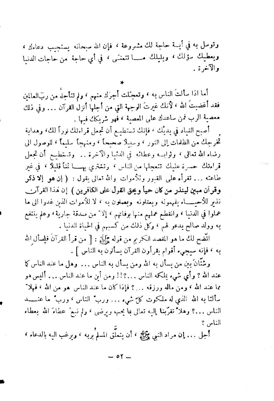أصبح القياد في يديك فإنك تستطيع أن تجعل قراءتك نوراً لك وهداية تخرجك من الظلمات إلى النور وسبيلاً صحيحاً ومنهجاً سليماً للوصول إلى رضاء الله تعالى وثوابه وعطائه في الدنيا والآخرة .. وتستطيع أن تجعل قراءتك حسرة عليك تتعجلها من الناس وتشتري بها ثمناً قليلاً في غير طاعته ... تقرأه على القبور وللأموات والله تعالى يقول: (إن هو إلا ذكر وقرأن مبين لينذر من كان حياً ويحق القول على الكافرين) إن هذا القرآن نذير للأحياء يفهمونه ويعقلونه ويعملون به لا للأموات الذين غدوا إلى ما عملوا في الدنيا وانقطع عملهم منها بوفاتهم إلا من صدقة جارية وعلم ينتفع به وولد صالح يدعو لهم وكل ذلك من كسبهم في الحياة الدنيا.