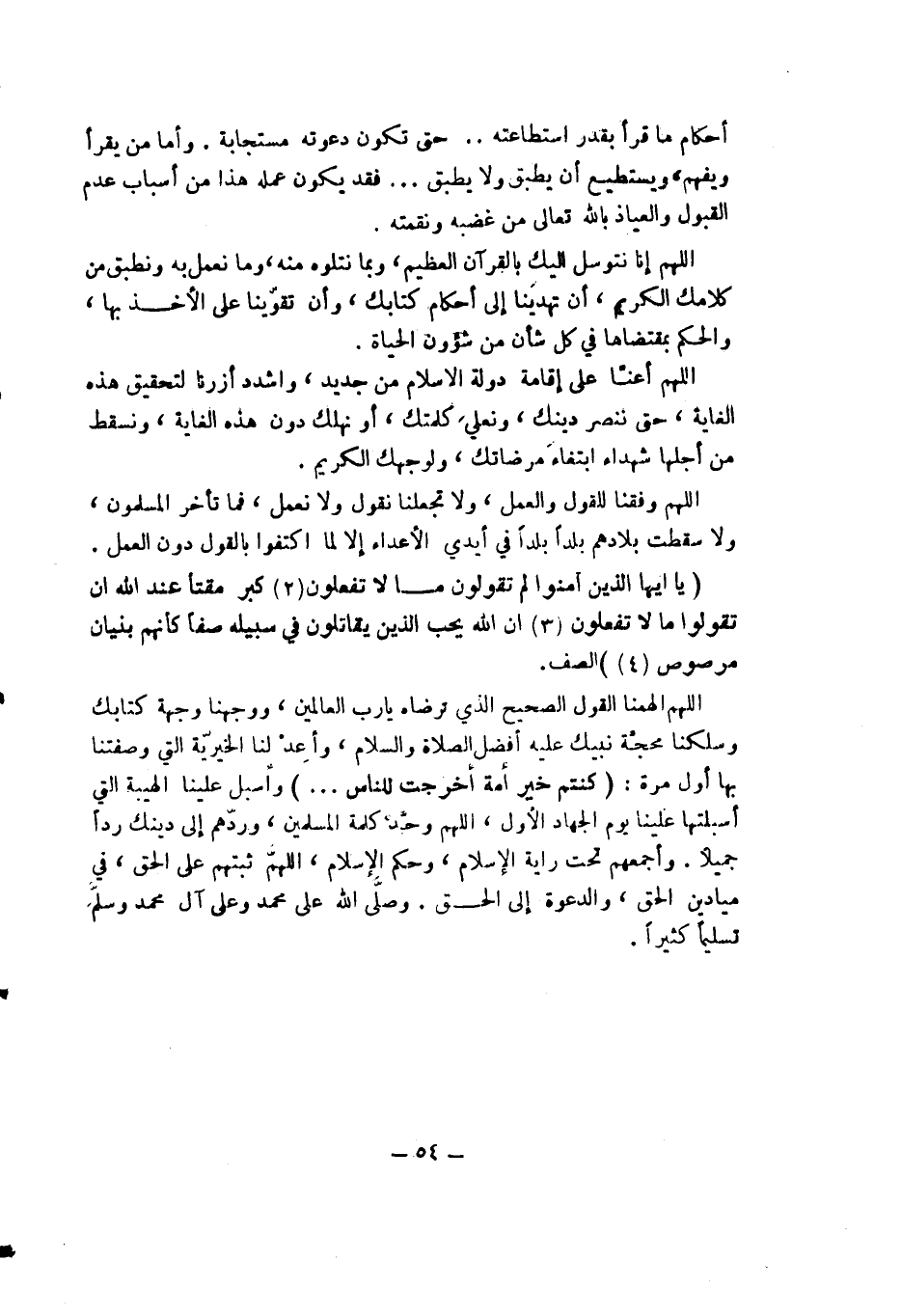 نبيك عليه أفضل الصلاة والسلام وأعد لنا الخيرية التي وصفتنا بها أول مرة: (كنتم خير أمة أخرجت للناس ... ) وأسبل علينا الهيبة التي أسبلتها علينا يوم الجهاد الأول اللهم وحد كلمة المسلمين وردهم إلى دينك رداً جميلاً وأجمعهم تحت راية الإسلام وحكم الإسلام اللهم ثبتهم على الحق في ميادين الحق والدعوة إلى الحق وصلى الله على نبينا محمد وعلى آله وصحبه وسلم تسليماً كثيراً.