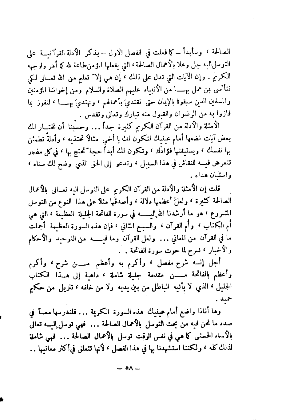 الصالحة كثيرة ولعل أعظمها دلالة وأصدقها مثلاً على هذا النوع من التوسل المشروع هو ما أرشدنا الله تعالى إليه في سورة الفاتحة الجليلة العظيمة التي هي أم الكتاب وأم القرآن والسبع المثاني فإن هذه السورة العظيمة أجملت ما في القرآن من المعاني ... ولعل القرآن وما فيه من التوحيد والأحكام والأخبار شرح لما حوت سورة الفاتحة ..
