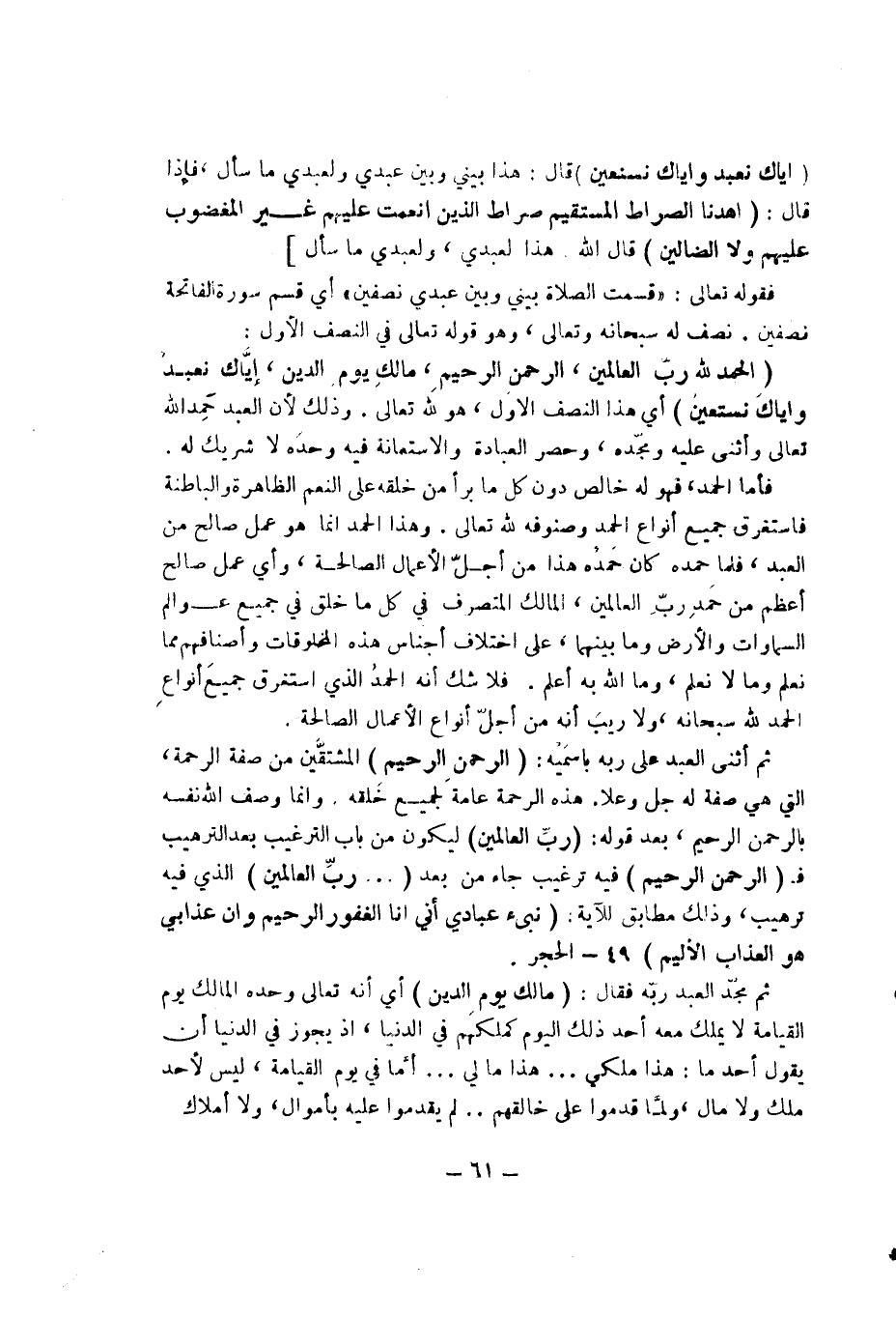 (الحمد لله رب العالمين الرحمن الرحيم مالك يوم الدين إياك نعبد وإياك نستعين) أي هذا النصف الأول هو لله تعالى وذلك لأن العبد حمد الله تعالى وأثنى عليه بحمده وحصر العبادة والاستعانة فيه وحده لا شريك له.