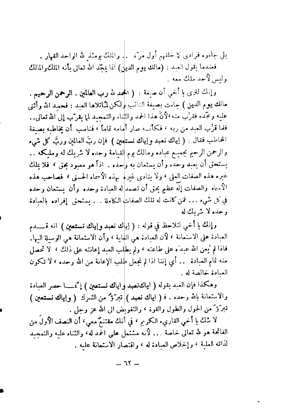 لا شك يا أخي القارئ الكريم في أنك مقتنع معي أن النصف الأول من الفاتحة هو لله تعالى خاصة .. لأنه مشتمل على الحمد له والثناء عليه والتمجيد لذاته العلية وإخلاص العبادة له واقتصار الاستعانة عليه.