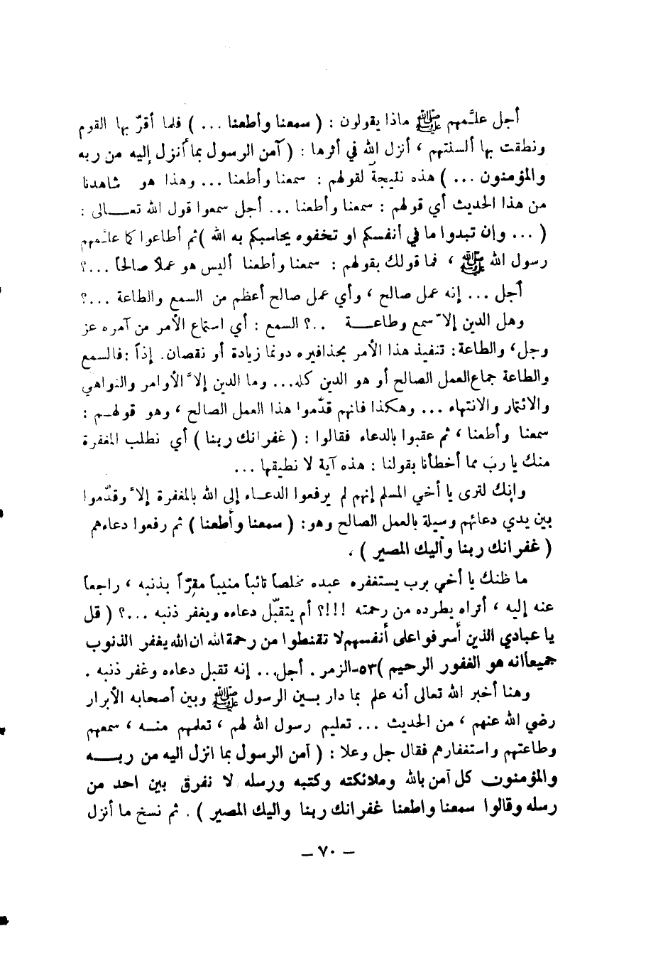 أجل علمهم - صلى الله عليه وسلم - ماذا يقولون: (سمعنا وأطعنا ... ) فلما أقر بها القوم ونطقت بها ألسنتهم أنزل الله في أثرها: (آمن الرسول بما أنزل إليه من ربه والمؤمنون ... ) هذه نتيجة لقولهم: سمعنا وأطعنا ... وهذا هو شاهدنا من هذا الحديث أي قولهم سمعنا وأطعنا ... أجل سمعوا قول الله تعالى: ( ... وإن تبدو ما في أنفسكم أو تخفوه يحاسبكم به الله) ثم أطاعوا كما علمهم رسول الله - صلى الله عليه وسلم -، فما قولك بقوله: سمعنا وأطعنا أليس هو عملاً صالحاً ... ؟