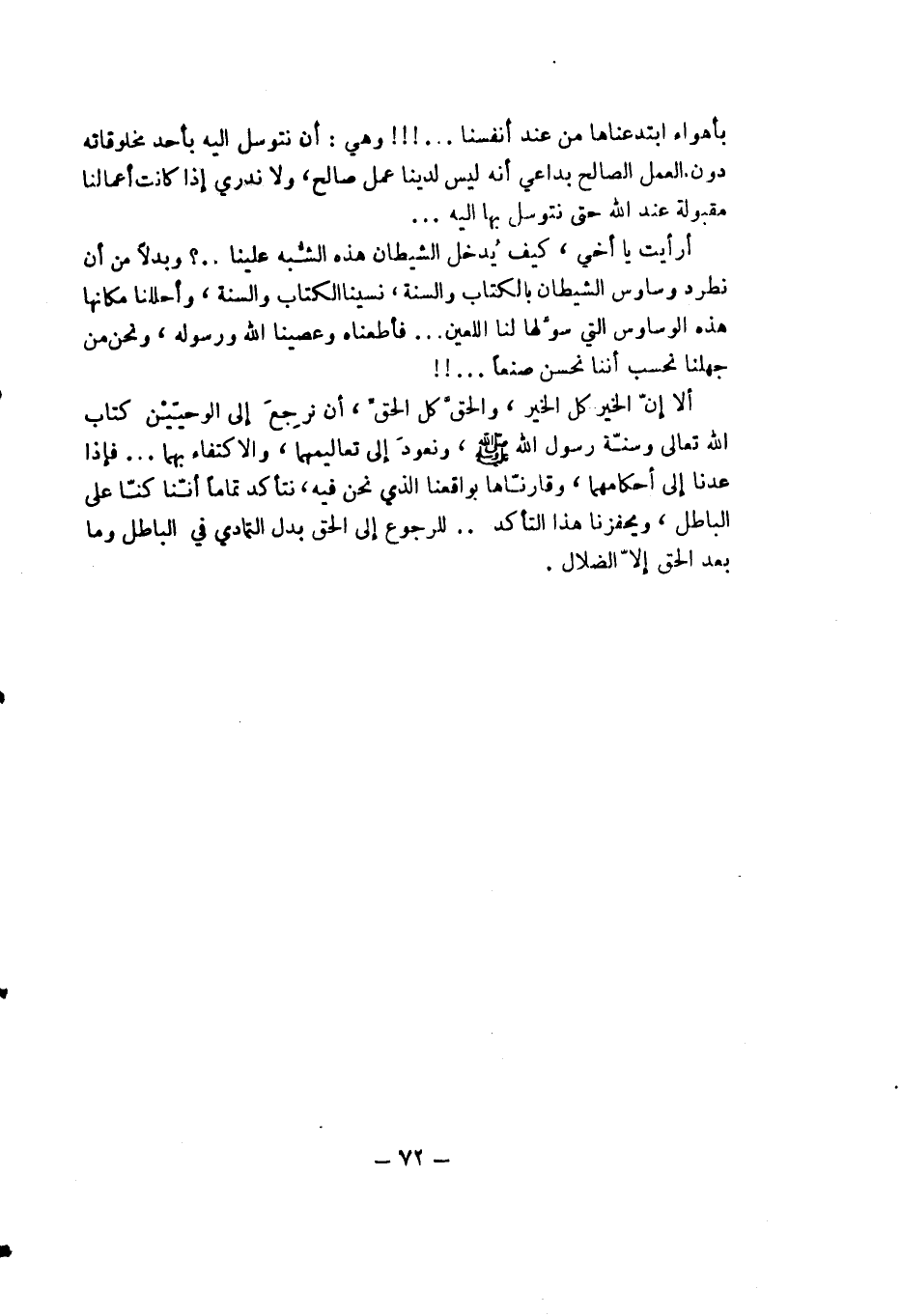ألا أن الخير والحق كل الحق أن نرجع إلى الوحيين كتاب الله تعالى وسنة رسول الله - صلى الله عليه وسلم - ونعود إلى تعاليمهما والاكتفاء بهما ... فإذا عدنا إلى أحكامهما وقارناها بواقعنا الذي نحن فيه نتأكد تماماً كنا على الباطل ويحفزنا هذا التأكيد .. للرجوع إلى الحق بدل التمادي في الباطل وما بعد الحق إلا الضلال.