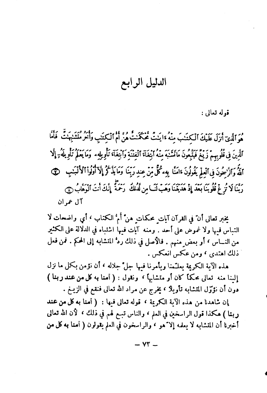هو الذي أنزل عليك الكتاب منه ءآيات محكمات هن أم الكتاب وأهر متشابهات فأما الذين في قلوبهم زيغ فيتبعون ما تشابه منه ابتغاء الفتنة وابتغاء تأويله وما يعلم تأويله إلا الله والراسخون في العلم يقولون ءامنا به كل من عند ربنا وما يذكر إلا أولوا الألباب (7) ربنا لا تزغ قلوبنا بعد إذ هديتنا وهب لنا من لدنك رحمة إنك أنت الوهاب (8) ... آل عمران