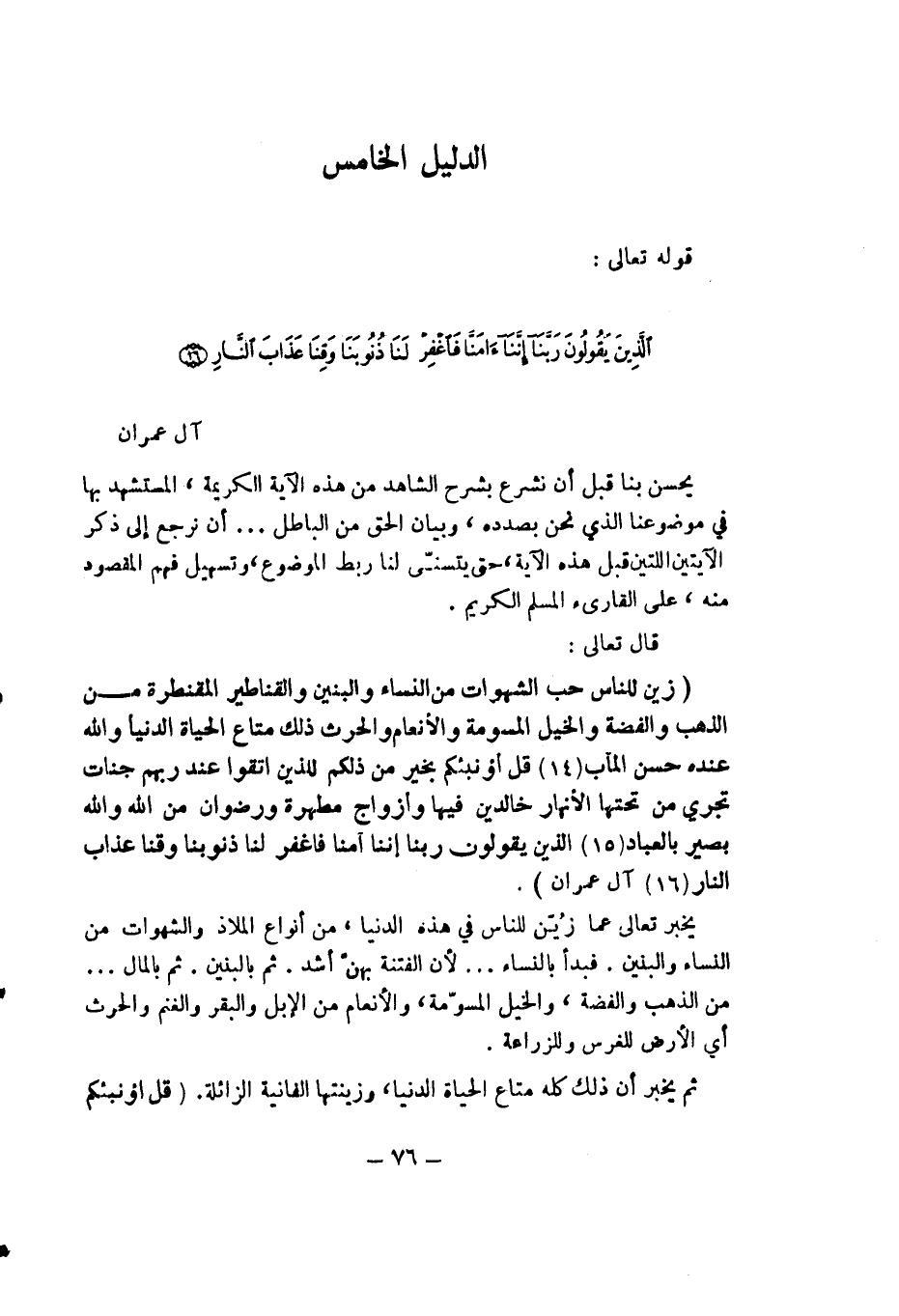 (زين للناس حب الشهوات من النساء والبنين والقناطير المقنطرة من الذهب والفضة والخيل المسومة والأنعام والحرث ذلك متاع الحياة الدنيا والله عنده حسن المآب (14) قل أؤنبئكم بخير من ذلكم للذين اتقوا عند ربهم جنات تجري من تحتها الأنهار خالدين فيها وأزواج مطهرة ورضوان من الله والله بصير بالعباد (15) الذين يقولون ربنا إننا آمنا فاغفر لنا ذنوبنا وقنا عذاب النار (16) آل عمران).